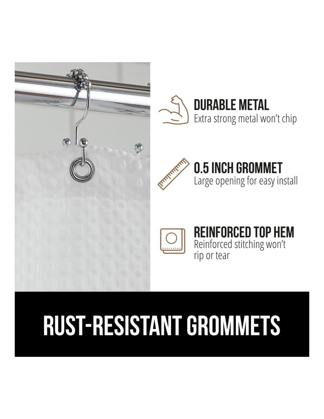 - OJALOS RESISTENTES AL ÓXIDO: 12 ojales de alta resistencia y resistentes al óxido bordean la parte superior de la cortina de ducha; la apertura en los ojales permite la fácil instalación de ganchos para cortinas de ducha; no incluye ganchos