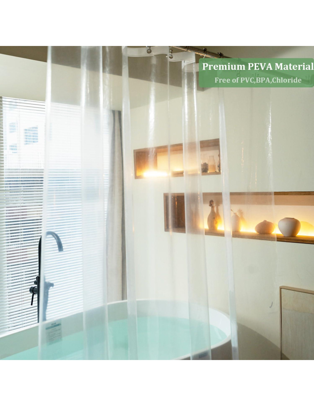 - [Tamaño y Cortina de Ducha Transparente y Sin Mal Olor] La cortina de ducha extra larga mide 72" (182.88 cm) de ancho x 74" (187.96 cm) de alto, lo que la hace perfecta para baños de ducha altos, y está hecha de material PEVA de alta calidad, que es el material más seguro. Además, el diseño transparente hace que tu baño sea más brillante. Se puede usar como una cortina de ducha independiente o como un forro de ducha para una cortina de ducha de tela.