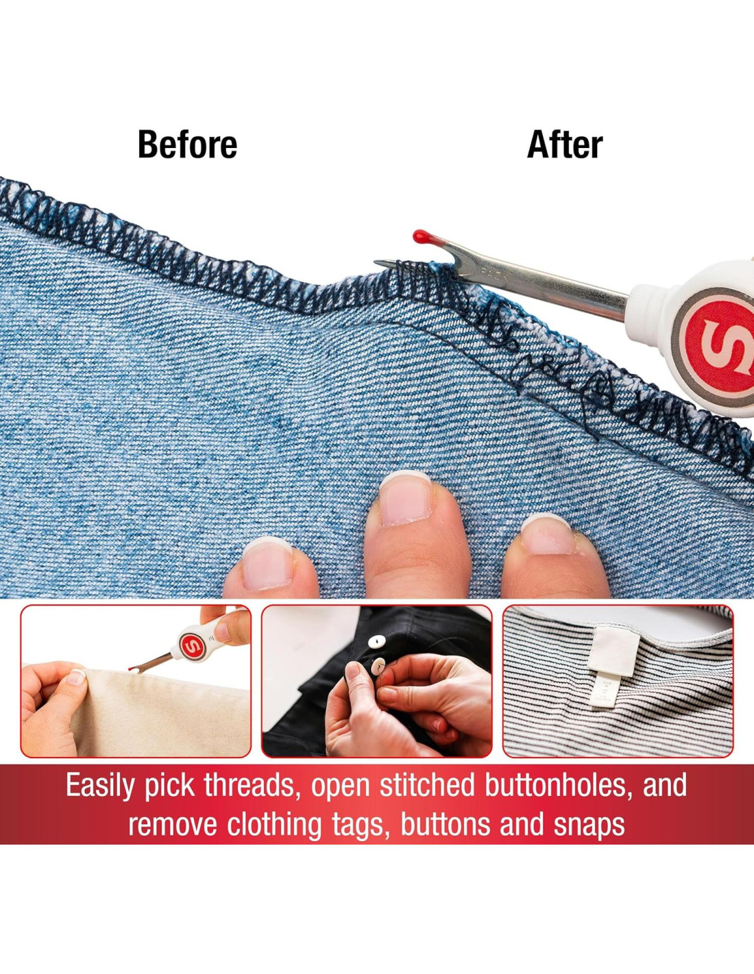 - Desbarbador de mano con agarre cómodo utilizado para deshacer hilos, abrir ojales cosidos y quitar botones y broches