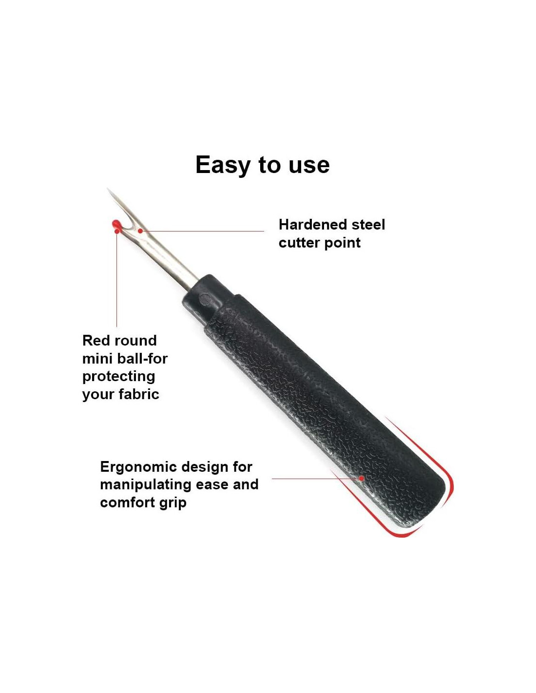 - Seguro y Seguro: Nuestro desgarrador con una bola mini redonda roja en el extremo del tenedor más pequeño para proteger tu tela. Bueno para cortar y desgarrar costuras no deseadas.