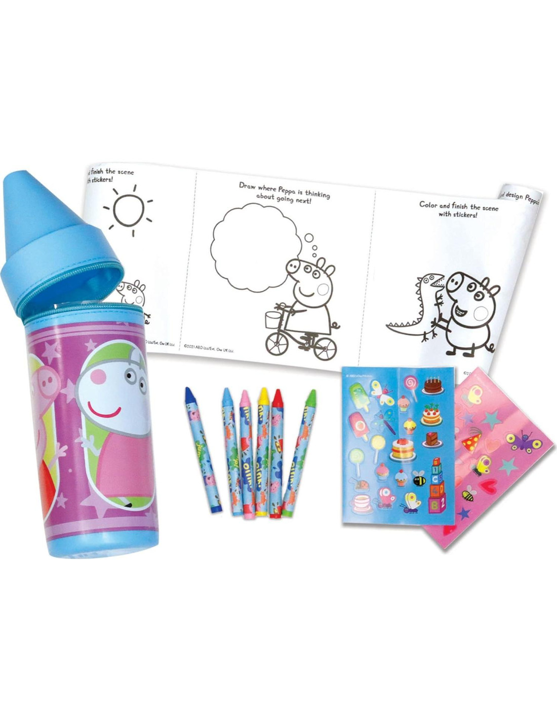 PEPPA PIG: ACTIVIDAD DE COLOR Y PEGATINAS: ¡Este divertido estuche en forma de crayón presenta a tus personajes favoritos de Peppa Pig! Cuenta con un cierre de cremallera que almacena todos los componentes de la actividad de vuelta dentro. ¡Descomprime la parte superior del estuche para revelar las actividades! El rollo de actividad de 3 metros crea horas de diversión creativa para tu pequeño. Completa cada escena de colorear con los crayones incluidos y luego tira del rollo de actividad a la siguiente escena. Usa las pegatinas incluidas para terminar las escenas. El set incluye un rollo de papel para actividades, crayones y pegatinas. Usa la muñequera para llevarlo a donde vayas. ¡Perfecto para viajar! Incluye 6 crayones, 2 hojas de pegatinas y un rollo de actividad de 3 metros. Licencia oficial de Peppa Pig.