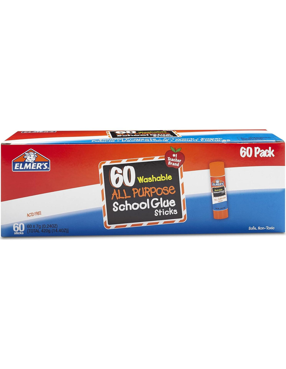 - Los crayones Crayola llegan organizados por color en secciones dentro de la caja de almacenamiento; el pegamento de Elmer's es lavable y se seca transparente.