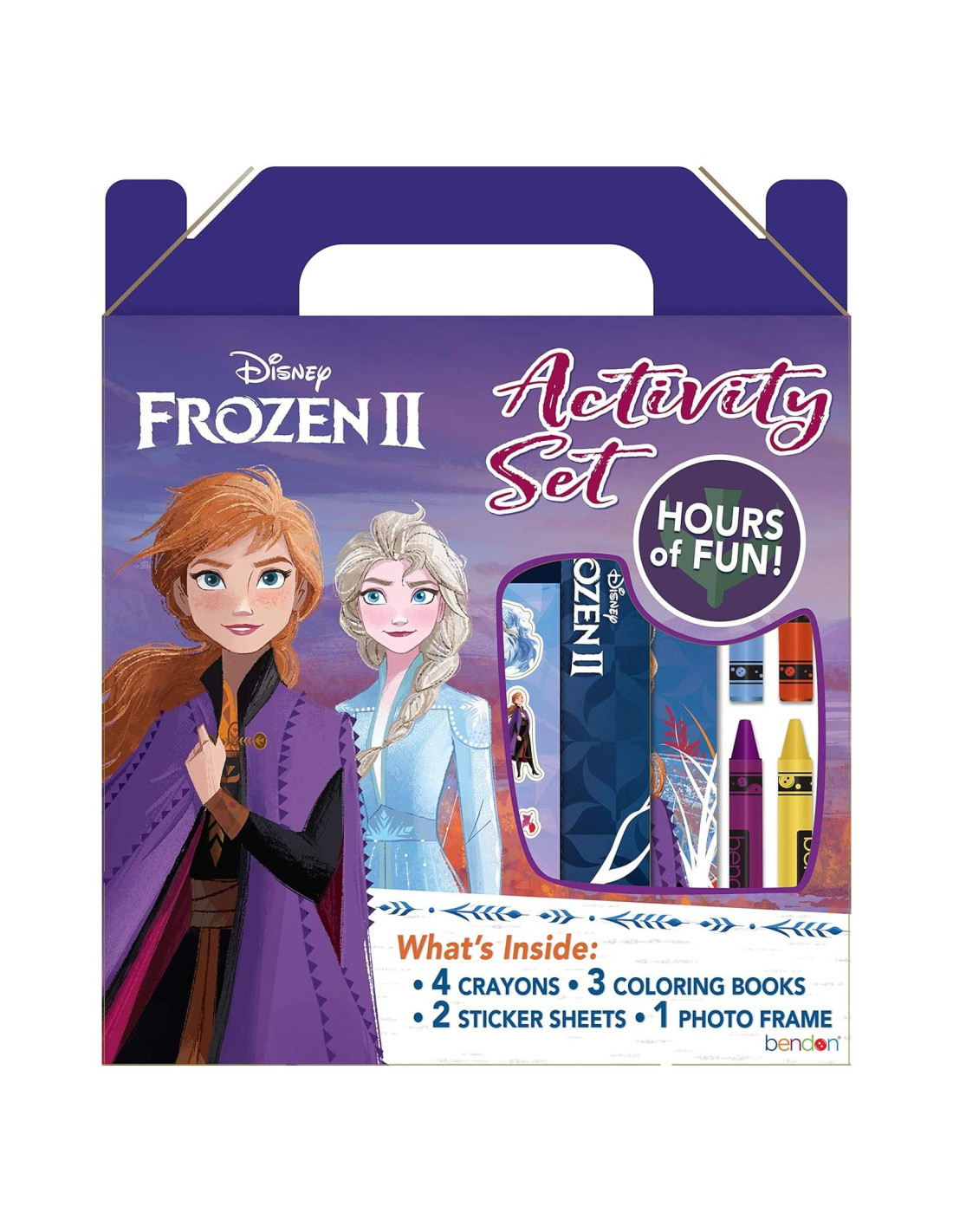 ¡Encuentra horas de diversión sin pantalla en el set de actividades portátil Bendon Frozen 2! Tu pequeño artista se divertirá con las actividades atractivas que incluye, como 3 libros para colorear, un marco troquelado, pegatinas y crayones jumbo. Además, todo cabe de nuevo en la caja reutilizable con asa para un fácil almacenamiento y transporte. ¡Incluye 3 libros para colorear de 24 páginas, un marco de imagen troquelado, 2 hojas de pegatinas y 4 crayones jumbo en una caja con asa! Este es un producto oficialmente licenciado de Disney, ¡no aceptes sustituciones! Ideal para edades de 3 años en adelante.