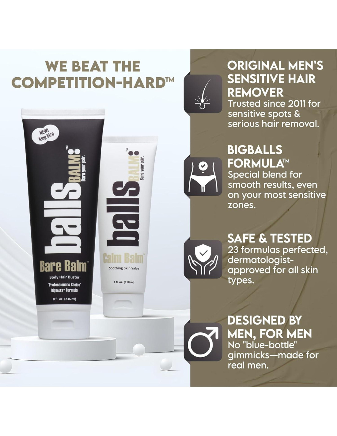 ballsBALM se enorgullece de ser el pionero en la eliminación de vello sensible para hombres. Fundada en 2011, hemos diseñado el mejor sistema de eliminación de vello que un hombre puede usar para manejar el vello corporal incluso en sus lugares más sensibles. Estamos cansados de que las empresas metan sus productos para chicas en una botella azul y digan que eso lo hace para hombres. De hecho, no nos sorprendería si ni siquiera usan sus propios eliminadores de vello de mala calidad. Ten la seguridad de que siempre hemos usado, y siempre usaremos, los productos que vendemos. ballsBALM significa control de calidad en todo momento. ballsBALM nunca prueba en animales... eso sería muy raro. En su lugar, utilizamos pruebas dermatológicas de terceros neutrales en personas. Personas muy dispuestas. El vello corporal en los lugares equivocados es molesto. Ya sea que estés apagando incendios o luchando por espacio en el gimnasio, elimina el vello corporal no deseado donde sea y mantente en la cima de tu juego. A menudo imitado pero nunca igualado, el ballsBALM Bare Pair es el apogeo de la eliminación de vello corporal masculino. Todos los productos de ballsBALM son desarrollados, probados y fabricados en una instalación 100% alimentada por energía solar en el sur de California porque la Madre Tierra está caliente. ¿Siempre sientes que tienes un suéter puesto incluso cuando estás desnudo? ¿El vello crece como kudzu de cada lugar que tienes? Lo entendemos, nosotros también. Los chicos que desarrollaron el Sistema de Manejo del Vello Corporal Bare Pair te traen una solución simple para eliminar el vello corporal no deseado para que puedas darle a tu cuerpo la definición que merece. Y dado que puedes usarlo en todas partes, incluso en 'zonas divertidas', no hay nada que detenga tu trasero peludo de ser sexy donde sea. Algunas empresas les gusta hablar sobre lo increíbles que son sus ingredientes, y nosotros no somos diferentes. Nos reunimos con docenas de productores, proveedores, compradores, fabricantes e incluso un agricultor o cuatro al elegir nuestros ingredientes. Fue una experiencia descubrir de dónde y cómo se obtienen todos los componentes de los productos de ballsBALM. Hicimos el trabajo duro para que no tengas que preocuparte por lo que estás poniendo en tu cuerpo. Usamos todos los productos de ballsBALM que vendemos y exigimos resultados seguros y efectivos cada vez, al igual que tú. No podemos creer que tengamos que decirlo, pero cortarnos con todos esos dispositivos de eliminación de vello 'medievales' es molesto. No solo te estás cortando por todas partes, tienes que cuidar esas cosas o se obstruyen y vomitan vello por todas partes. Después de solo dos usos, hemos encontrado en las pruebas que la mayoría de los recortadores necesitan un montón de mantenimiento para funcionar correctamente o tienden a arrancar el vello porque se niegan a trabajar. Y son insalubres como el infierno. Olvídate de los trucos de las cuchillas y toma la comodidad de eliminar el vello corporal no deseado con el ballsBALM Bare Pair. La mayoría de los métodos de eliminación de vello olvidan proteger y fortalecer la piel. No nosotros. Usa Bare Balm y Calm Balm juntos para eliminar el vello corporal y terminar feliz. ballsBALM no es el eliminador de vello más barato que existe por una razón muy importante: es el mejor. No escatimamos en gastos para ofrecer a los hombres una opción de eliminación de vello que realmente funcione en cada parte de su cuerpo sin dolor. Olvídate de los imitadores baratos y de los artilugios de cuchillas sospechosos y elimina el vello corporal como un profesional.