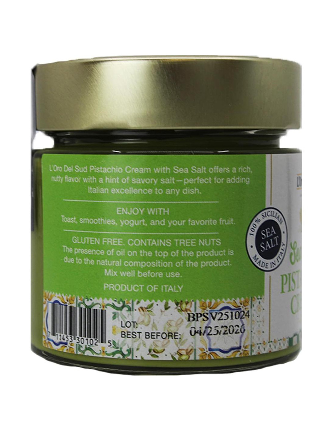 - Disfruta del equilibrio único de dulce y salado en la Crema de Pistacho L'Oro Del Sud con Sal Marina. Hecha en Sicilia, esta crema de pistacho suave combina pistachos finamente molidos con un toque de sal marina para un sabor distintivo que funciona tanto en platos dulces como salados.
