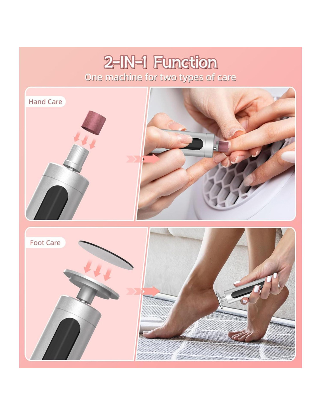 - Función 2 EN 1: Este removedor de callos para pies viene con dos cabezales de molienda, el grande puede eliminar fácilmente y de manera efectiva la piel muerta seca y áspera de tus pies, haciendo que tus pies sean suaves y lisos nuevamente, y el pequeño se puede usar para pulir uñas y manicura, una máquina para dos tipos de cuidado.