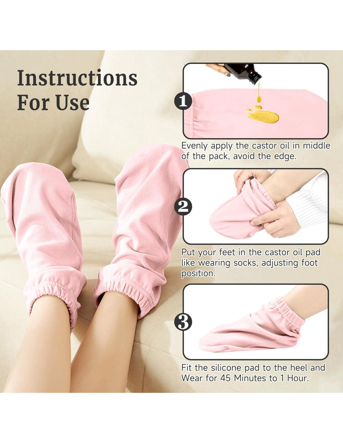 - Uso en Múltiples Escenarios: Ya sea que estés durmiendo, bebiendo té, haciendo yoga u otras actividades, puedes llevar y usar nuestro paquete de envoltura de aceite de ricino contigo, y disfrutar del cuidado de tus pies con aceite de ricino en cualquier momento