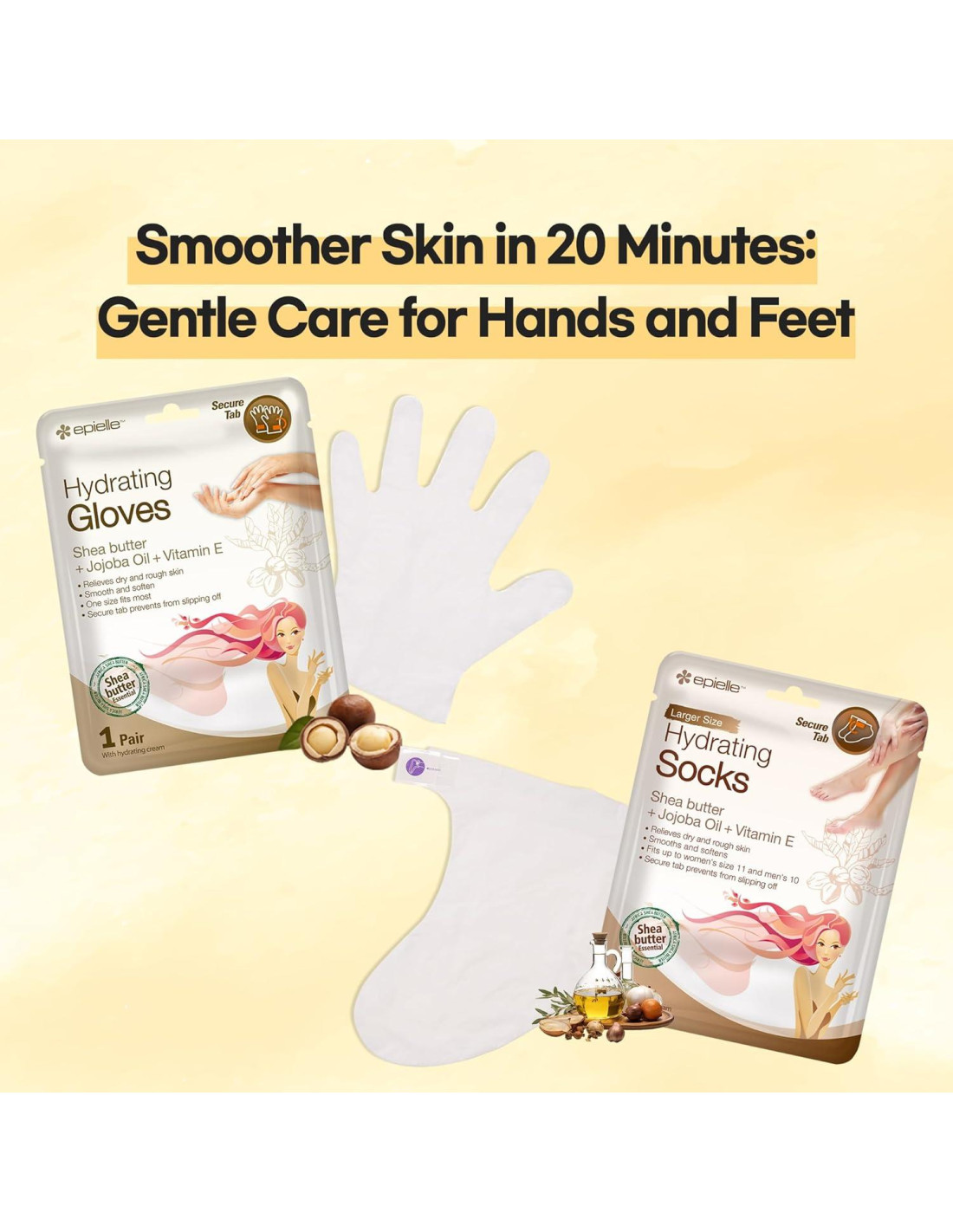 - NUTRIDO: ¡Sumerge tus pies en nuestros calcetines y guantes hidratantes de epielle! Los calcetines y guantes hidratantes contienen manteca de karité, aceite de jojoba y extracto de vitamina E para hidratar profundamente tus pies de talón a dedo.