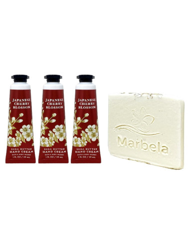 Conjunto de Crema de Manos de Manteca de Karité de Flor de Cerezo Japonesa de Bath & Body Works con un Jabón de Muestra de Avena Natural Marbela. INCLUYE: 3 Cremas de Manos de Manteca de Karité (1 fl oz / 29 mL cada una) y un Jabón de Muestra de Avena Natural Marbela (el jabón puede variar). Flor de Cerezo Japonesa - Cómo huele: el equivalente en fragancia de tu pequeño vestido negro, hermoso, atemporal y querido. Notas de fragancia: pera, flor de cerezo japonesa, sándalo. Qué hace: deja tus manos sintiéndose suaves, lisas y nutridas. Jabón de Muestra Marbela - Mientras que los jabones ordinarios resecan tu piel, Marbela se especializa en jabones y productos de baño hidratantes y 100% naturales que llevarán tu rutina de autocuidado al siguiente nivel. La prioridad es crear productos que sean 100% naturales, veganos, libres de crueldad y, lo más importante, hechos a mano con amor.