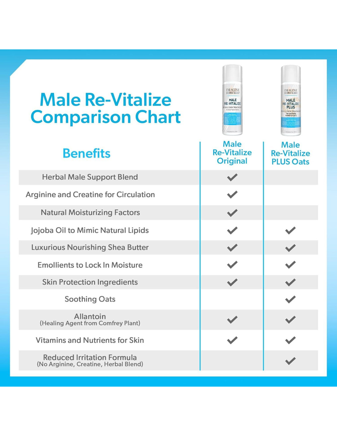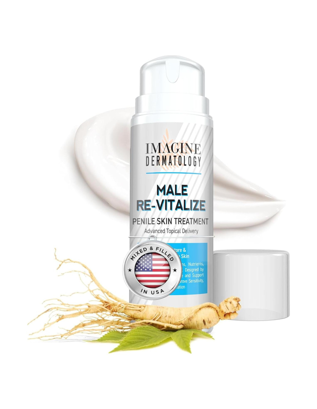Establecido por científicos con más de 50 años de experiencia en farmacéutica, cuidado de la piel, salud y bienestar. Nuestro historial incluye la creación de marcas de consumo exitosas vendidas en el mercado masivo y en línea. Imagine Dermatology fue fundada para llevar nuestra experiencia directamente a los consumidores. Nuestros productos, elaborados por expertos en piel, aseguran soluciones tópicas efectivas. Cumple con los estándares cGMP en EE. UU., probado de forma independiente por laboratorios de terceros y libre de crueldad. Ofrecemos productos de alta calidad y valor a nuestros clientes. Nuestra Crema de Salud Penil Original Male Re-Vitalize y Re-Vitalize PLUS mejoran la circulación, aumentan la sensibilidad y restauran la salud penil. Formulada con Arginina, Carnitina, Niacinamida y extractos herbales, nuestras cremas peniles hidratantes calman la piel y crean un escudo protector para la rejuvenecimiento. Restaura la salud penil con una mezcla de vitaminas y extractos para apoyar el bienestar íntimo masculino. Mejora tu bienestar íntimo con nuestras cremas de salud penil. Formuladas para calmar y reparar, apoyan el flujo sanguíneo para una mejor sensibilidad. Nuestras cremas peniles ayudan a restaurar la piel irritada y rozada y crean una barrera invisible para proteger e hidratar, dando una piel más saludable y cómoda. ¿Irritará esto las partes íntimas de mi pareja? Este producto es seguro para membranas mucosas, pero es mejor cuando se absorbe antes del contacto. ¿Puedo usarlo en otras partes de mi cuerpo? Sí, es seguro para usar en otras partes íntimas o en cualquier parte del cuerpo. Las sensibilidades individuales pueden variar. ¿Cuál es la diferencia entre las versiones Original y PLUS Avena? Original tiene beneficio de circulación, PLUS Avena tiene el poder añadido de la Avena sin el apoyo de circulación. Orig Male Re-Vitalize 150 Orig Male Re-Vitalize 100 Male Re-Vitalize Plus 150 Male Re-Vitalize Plus 100