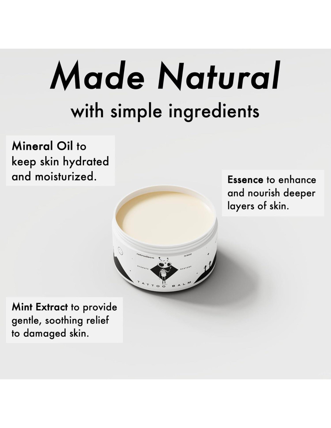 - Hecho con Ingredientes Naturales: Esta poderosa mezcla de aceite mineral, esencia y extracto de menta nutre e hidrata profundamente tu piel, proporcionando una suave sensación de frescor mientras ayuda a prevenir costras y picazón para un cuidado óptimo del tatuaje.