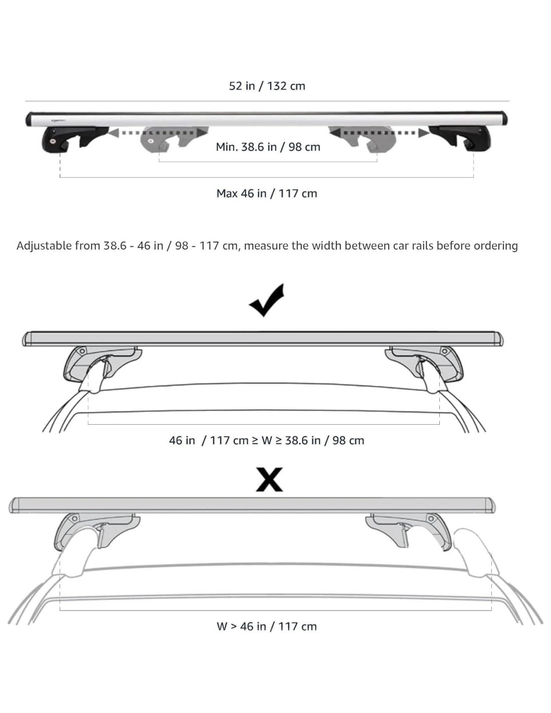 - Por favor verifica las dimensiones compatibles del travesaño antes de realizar tu compra. El travesaño de techo de 56 pulgadas (142,24 cm) se monta en la mayoría de los coches, SUV o crossover con rieles longitudinales elevados, el espacio entre el riel y el techo del coche debe ser de 1/2 pulgada (1,3 cm) y superior, la distancia entre los dos rieles debe ser mayor a 42 pulgadas (106,68 cm) y menor a 49.6 pulgadas (126,04 cm), el diámetro del riel debe estar entre 1.4-2.1 pulgadas (36-55 mm). Ajuste del vehículo encontrado en la Descripción del Producto a continuación.