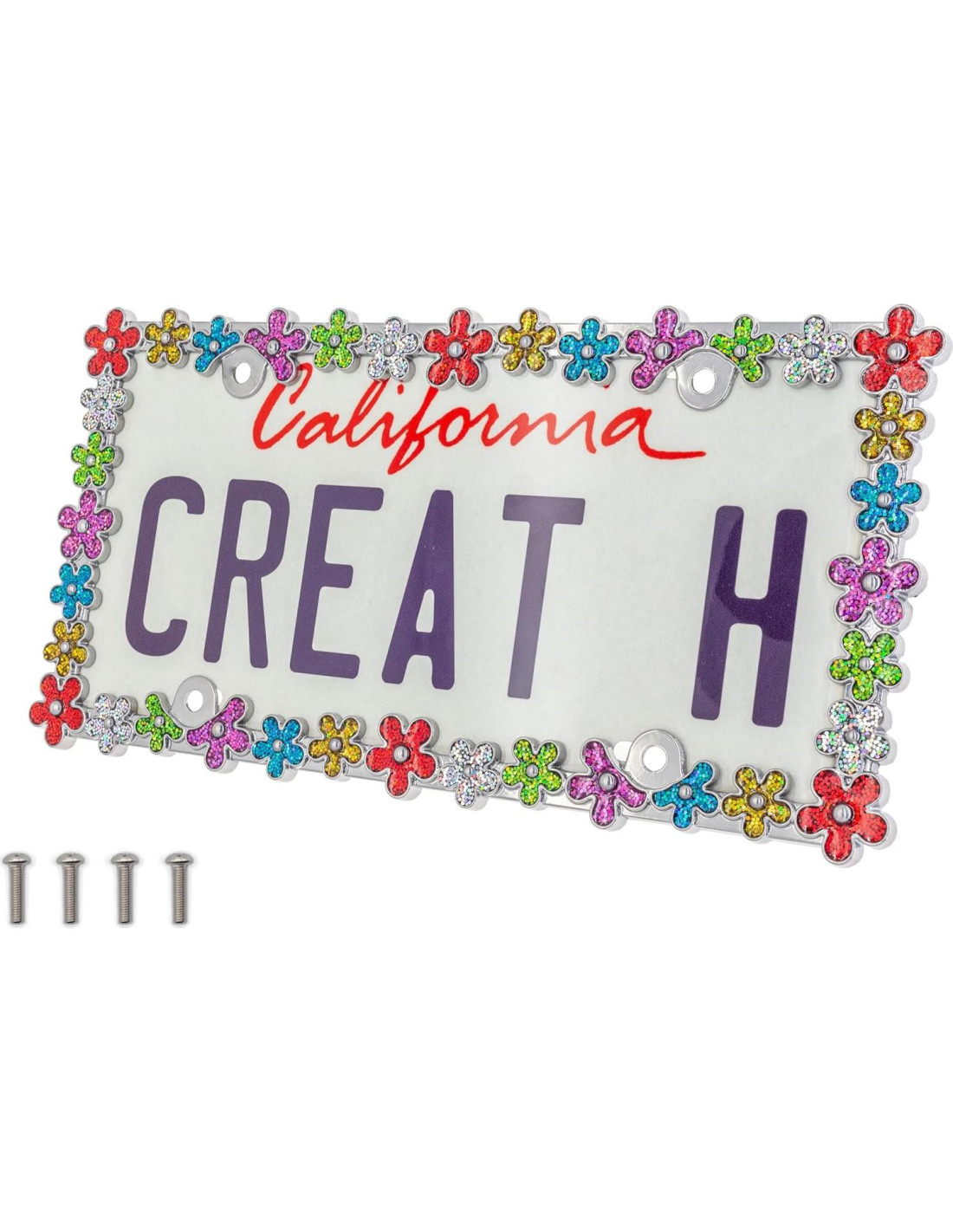 - DISEÑO VITALIDAD - Marcos de placas de licencia cromados con brillo colorido. Guirnaldas de margaritas alrededor de toda la placa. El brillo brillante hace que la margarita se vea fresca y genial, natural, llena de vitalidad. Hace que tu auto sea dulce y disfrute del sol de verano.