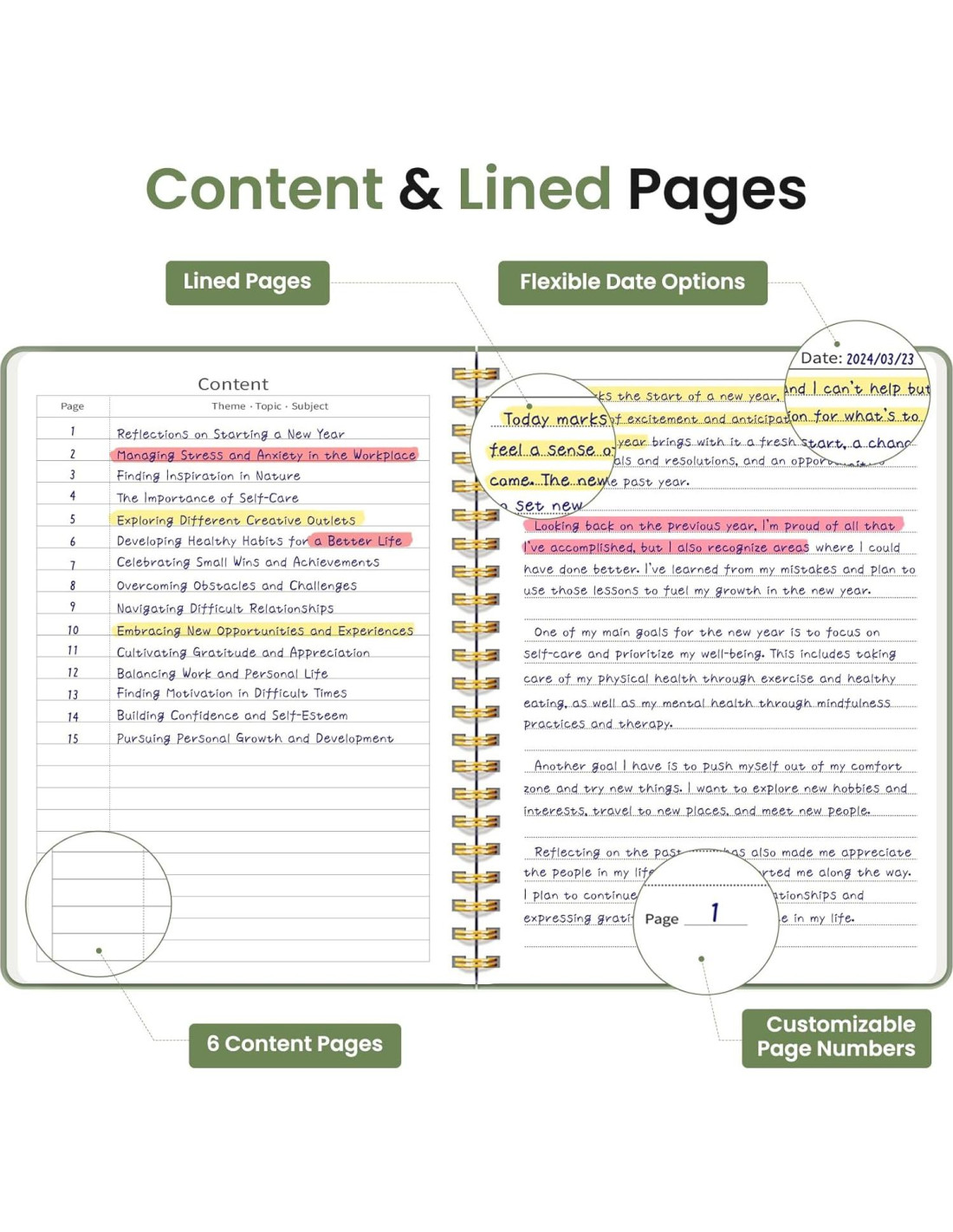 - Diseño Organizado y Funcional: Con 140 páginas rayadas y una tabla de contenido en 6 páginas en blanco, nuestro cuaderno ofrece amplio espacio para tomar notas y fácil referencia. Un bolsillo interior mantiene seguros los artículos diversos, y una banda de cierre elástica asegura que el cuaderno permanezca cerrado cuando no está en uso.