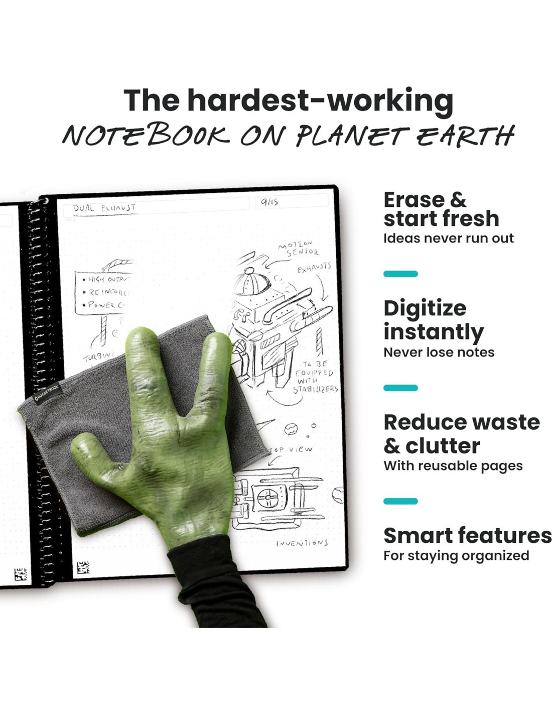 - Nuevo y Mejorado Core: Presenta papel reutilizable premium, con una mejor sensación de lápiz sobre papel, encuadernación en espiral y cubierta rediseñada, resistente a rayones. Las páginas con diseño de cuadrícula ahora incluyen Títulos Inteligentes y Etiquetas Inteligentes para nombrar y organizar archivos de manera eficiente. Crea, Digitaliza, Borra, Re-Crea: Captura ideas con el bolígrafo Pilot Frixion incluido, digitaliza sin esfuerzo usando la app Rocketbook, almacena en tu servicio de nube preferido. Cuando termines, simplemente limpia las páginas con un paño húmedo y comienza de nuevo.