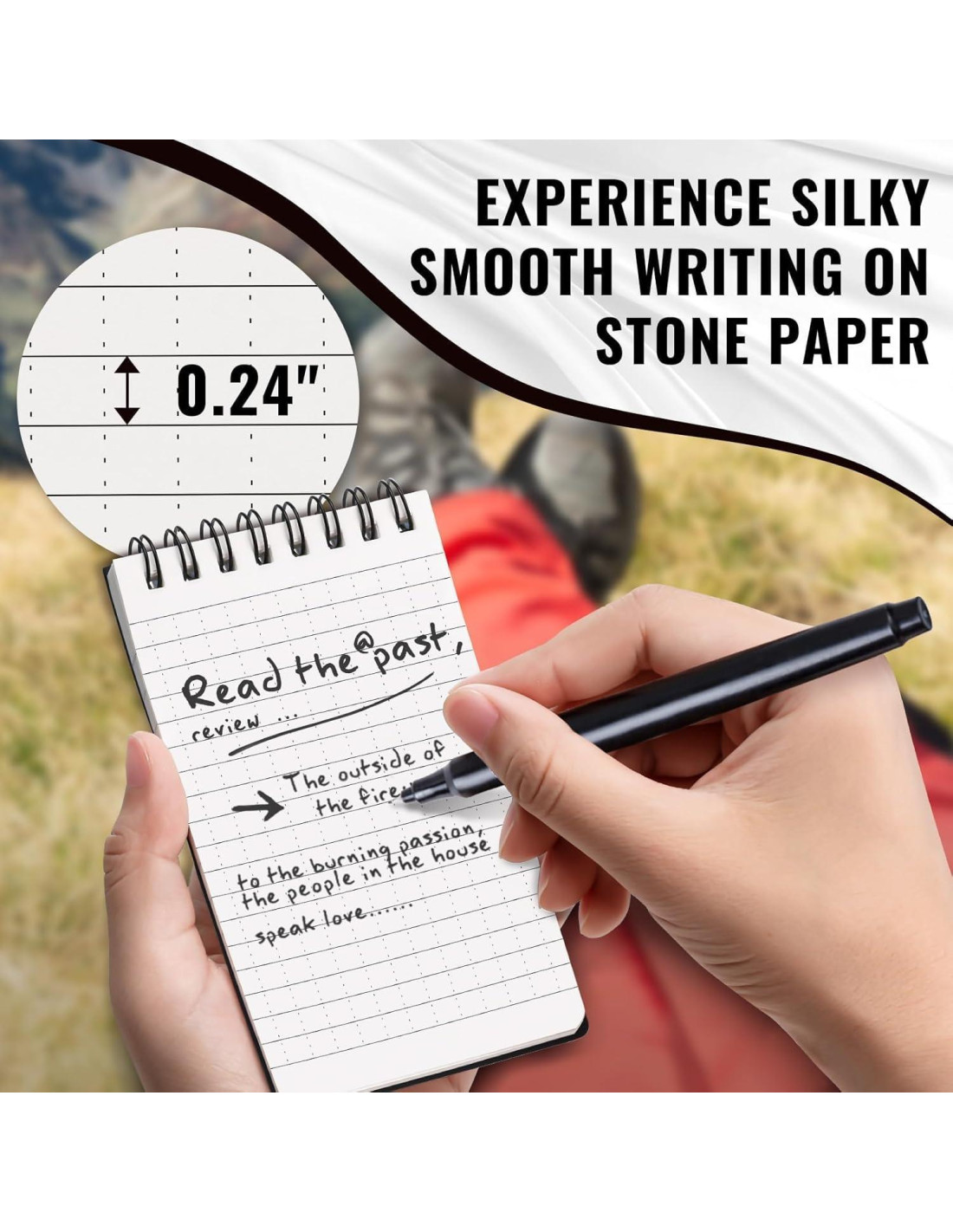 - Cuaderno Resistente a la Intemperie: Compatible con bolígrafos y lápices resistentes a la intemperie, puedes escribir de manera legible y confiada, incluso bajo la lluvia. Los bolígrafos de bola y los marcadores permanentes funcionan perfectamente cuando el papel está seco, mientras que las tintas a base de agua se deslizan sobre las hojas. Pero eso no es todo: la verdadera magia radica en el toque suave del papel de piedra mineral, proporcionando una experiencia de escritura inigualable. Siente el deslizamiento suave de tu pluma sobre las páginas, haciendo que tomar notas sea un verdadero placer.