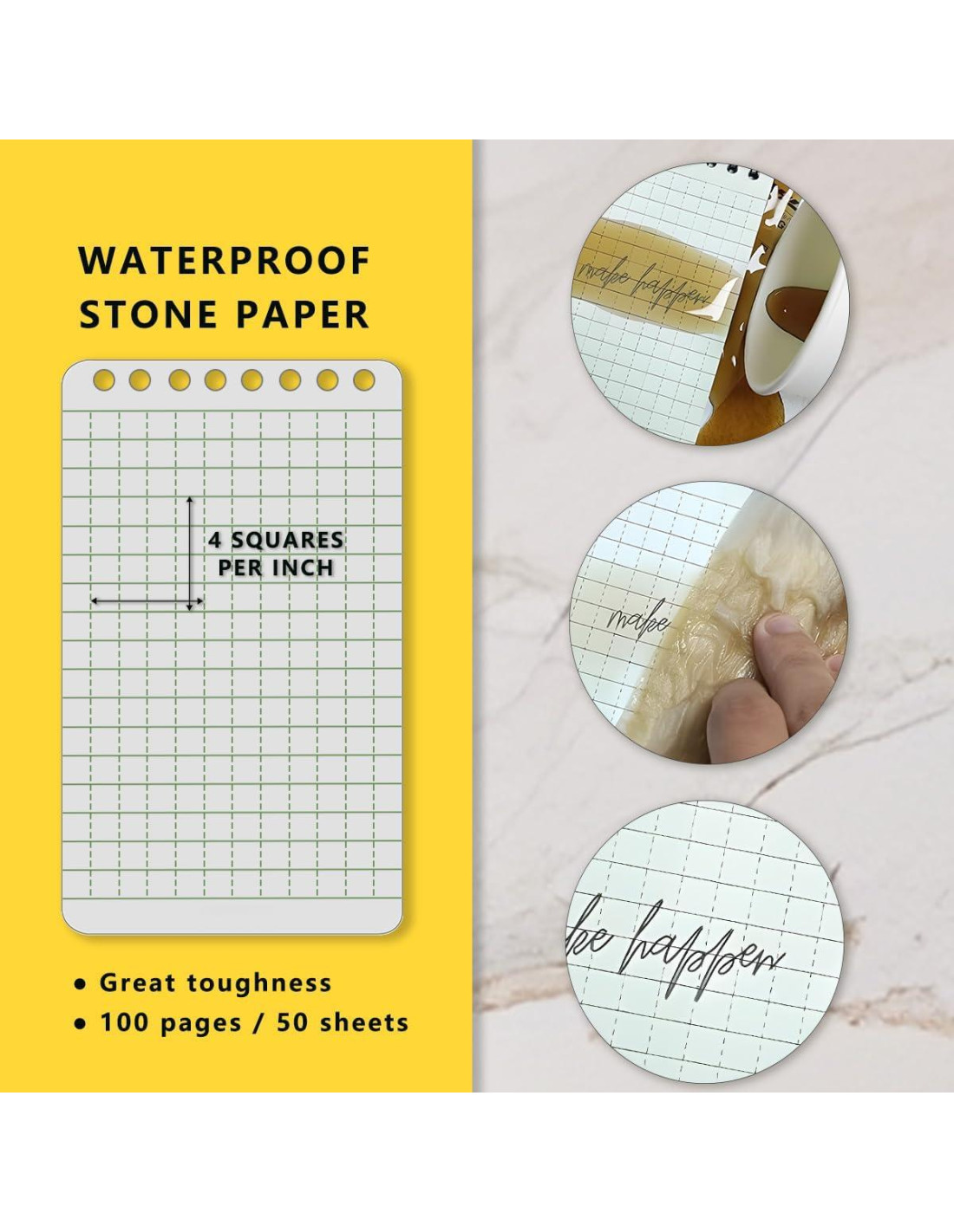 - PAPEL DE PIEDRA: Este cuaderno espiral está hecho de papel de piedra con características de impermeabilidad, gran resistencia y biodegradabilidad. La escritura en el papel de piedra húmedo sigue siendo clara.
