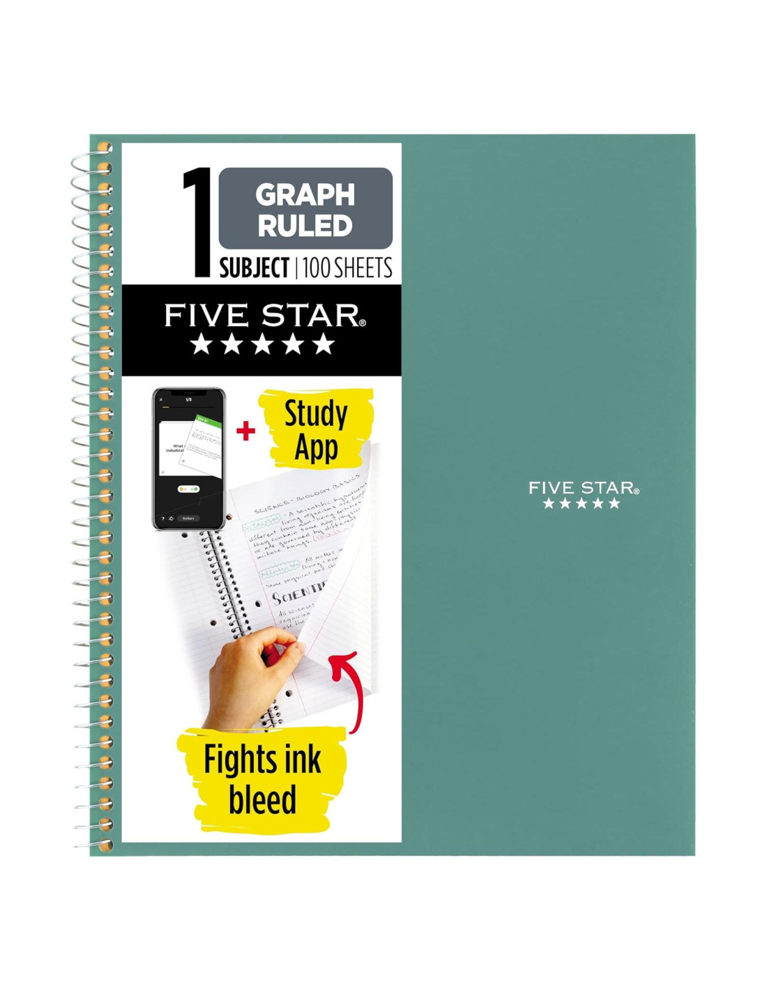 DURA TODO EL AÑO. ¡GARANTIZADO! Escanea, estudia y organiza tus notas con la Aplicación de Estudio Five Star. Crea tarjetas de memoria instantáneas y sincroniza tus notas con Google Drive para acceder a ellas desde cualquier dispositivo. Este Cuaderno de 1 Asignatura Five Star tiene 100 hojas cuadriculadas de doble cara que combaten la filtración de tinta y son perforadas para facilitar el desgarro. 4 cuadrados por pulgada, ideal para graficar, gráficos y proyectos de ingeniería. Las hojas miden 21.6 cm x 27.9 cm cuando se desgarran. Los bolsillos resistentes ayudan a prevenir desgarros y sostienen hojas sueltas de 21.6 cm x 27.9 cm, folletos y más. La cubierta frontal de plástico duradera es resistente al agua para ayudar a proteger tus notas durante todo el año, mientras que el alambre Spiral Lock ayuda a prevenir enganches en la ropa y mochilas. Hecho con papel certificado por SFI. El cuaderno es reciclable: solo quita la cinta de refuerzo en el bolsillo y recicla el resto. Disponible en Verde Cristal. La garantía es válida por un año a partir de la fecha de compra o entrega, lo que sea más largo. No cubre el uso indebido.