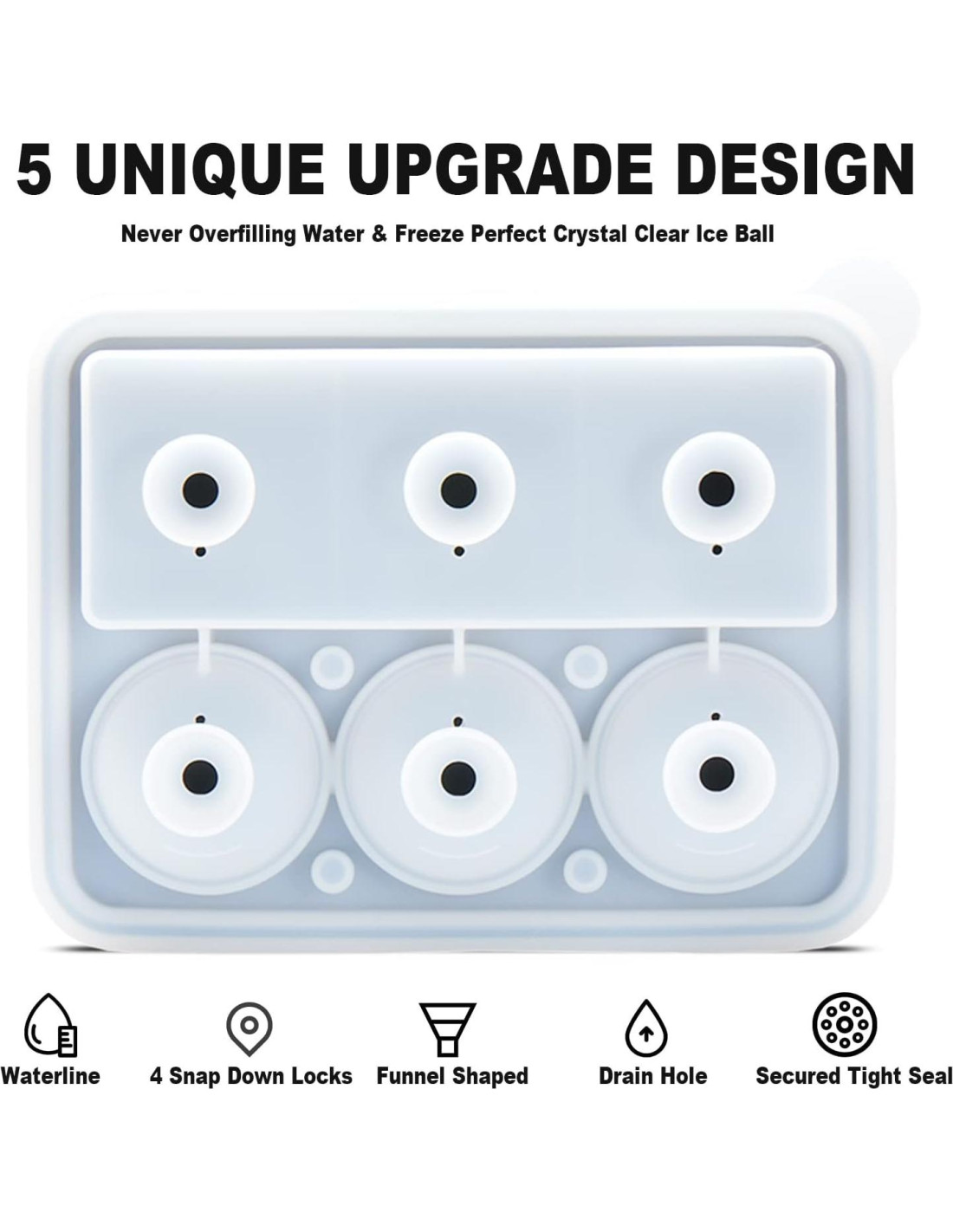 - [Diseño Único Mejorado para Prevenir el Desbordamiento] Nunca sobrellenarás agua con este molde de cubos de hielo gracias al diseño único de línea de agua y orificio de drenaje. Solo llena agua por los SEIS agujeros en forma de embudo de la tapa directamente, no se requiere taza medidora, sin conjeturas, puedes obtener bolas de hielo y cubos de hielo cristalinos fácilmente con estos moldes de cubos de hielo para cócteles.