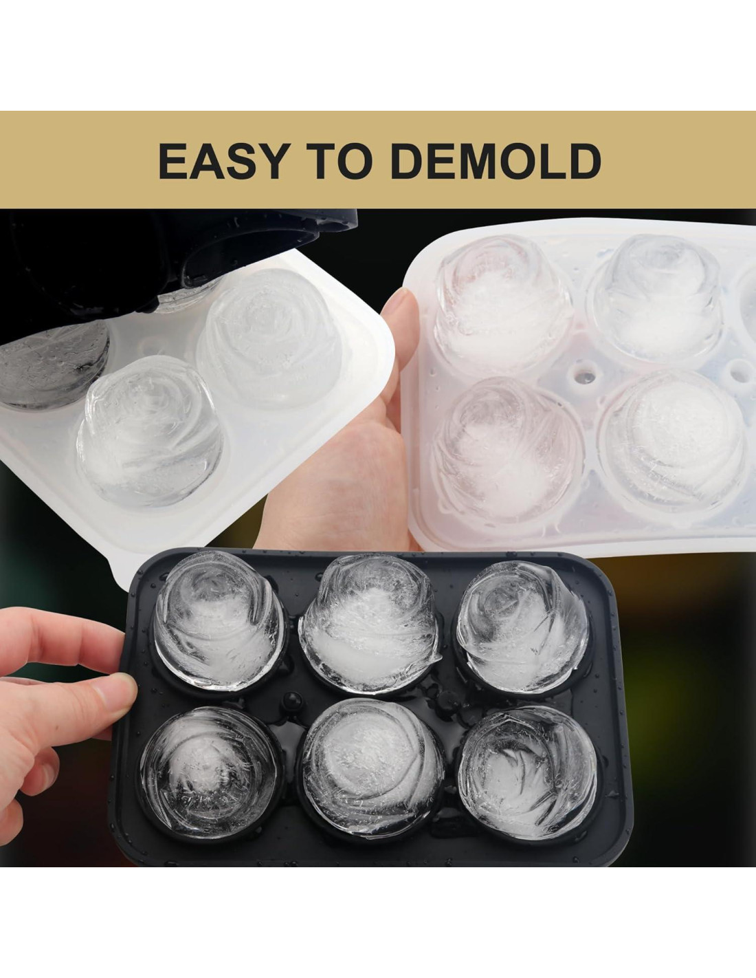 - Liberación de hielo sin esfuerzo. La bandeja de hielo de silicona flexible y libre de BPA con espacio adicional entre los moldes te permite sacar bolas de hielo en forma de rosa sin agrietarse. Ideal como moldes de hielo para whisky, moldes de hielo grandes, o bandeja de hielo para café.