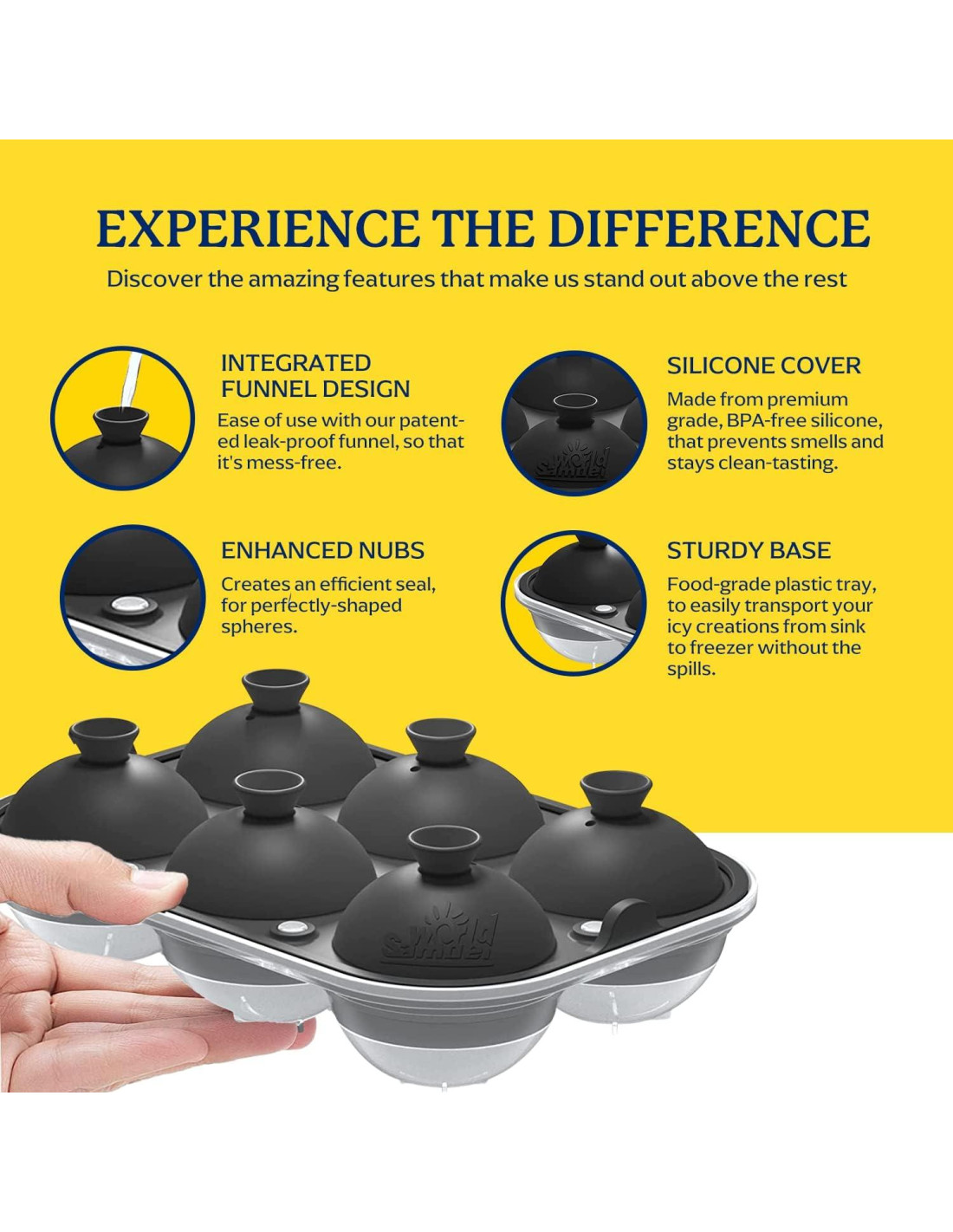 - FACILIDAD DE USO: Crea 6 esferas de hielo grandes perfectamente formadas con absoluta facilidad. La gama de bandejas de esferas de 6.35 cm de Samuelworld para el congelador están diseñadas con un sistema de embudo integrado, para un llenado más eficiente que también es sin desorden! Nunca más tendrás que preocuparte por perder embudos para tus bandejas de hielo.