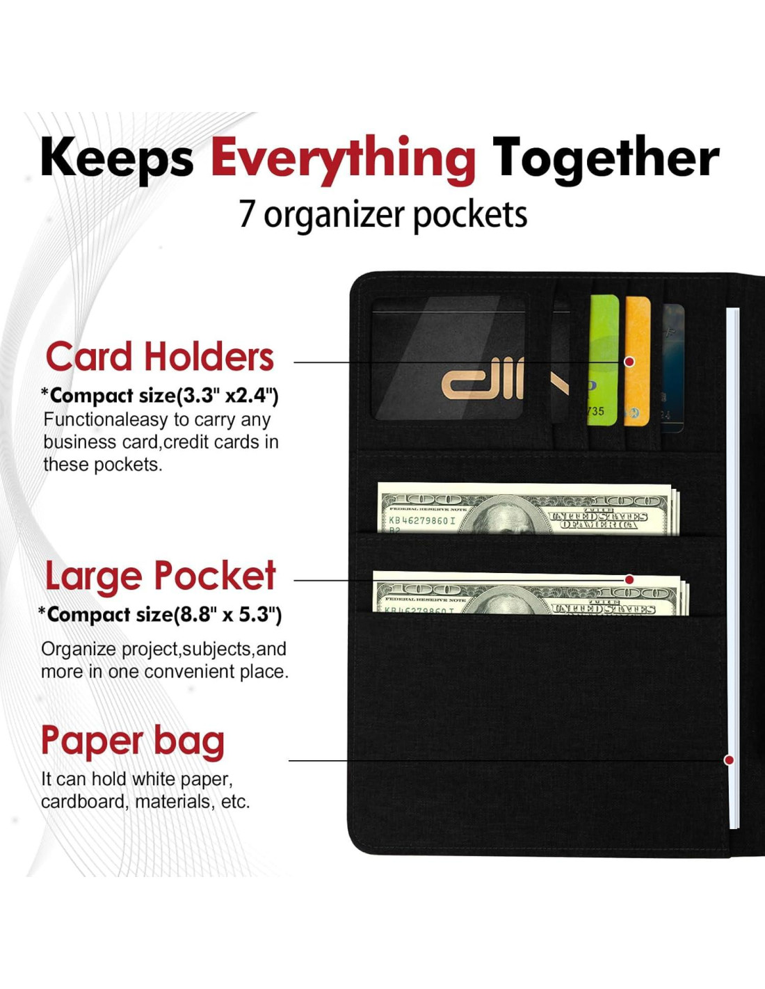 - 3. Presenta 4 ranuras para tarjetas, 3 bolsillos para documentos y un soporte para bolígrafos de gran tamaño (sostiene hasta 10 bolígrafos). Almacena de forma segura identificaciones, recibos y accesorios en un solo estuche optimizado.