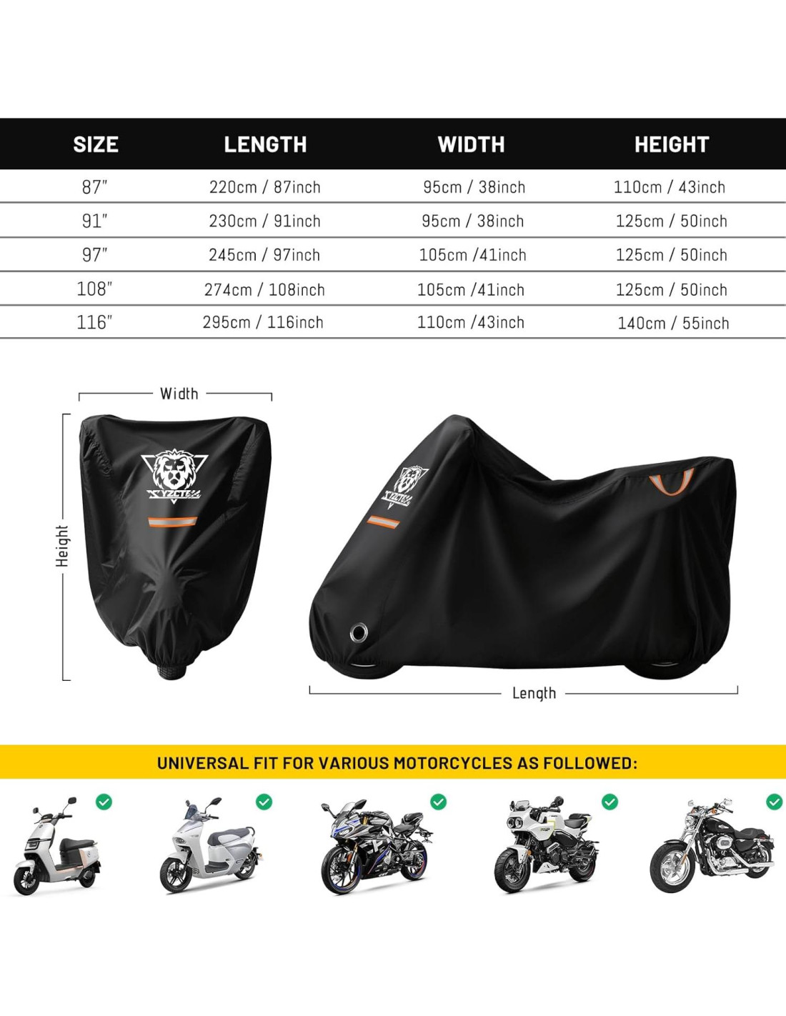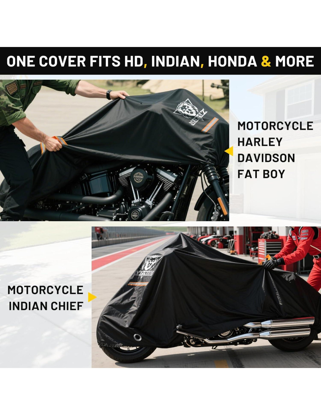- Ajuste Universal: Diseñado para ajustarse a múltiples motocicletas de hasta 87 pulgadas (220 cm) de longitud, Compatible con Harley Davidson, Honda, Suzuki, Kawasaki, Yamaha, Indian y más