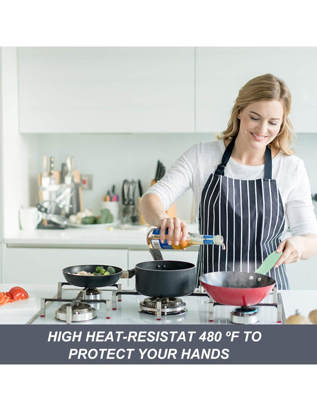 - SILICONA DE BUENA CALIDAD: Sin olor a goma al calentarse, apto para lavavajillas. Resistente al Calor hasta 480 F (248.89 C) para proteger tus manos.