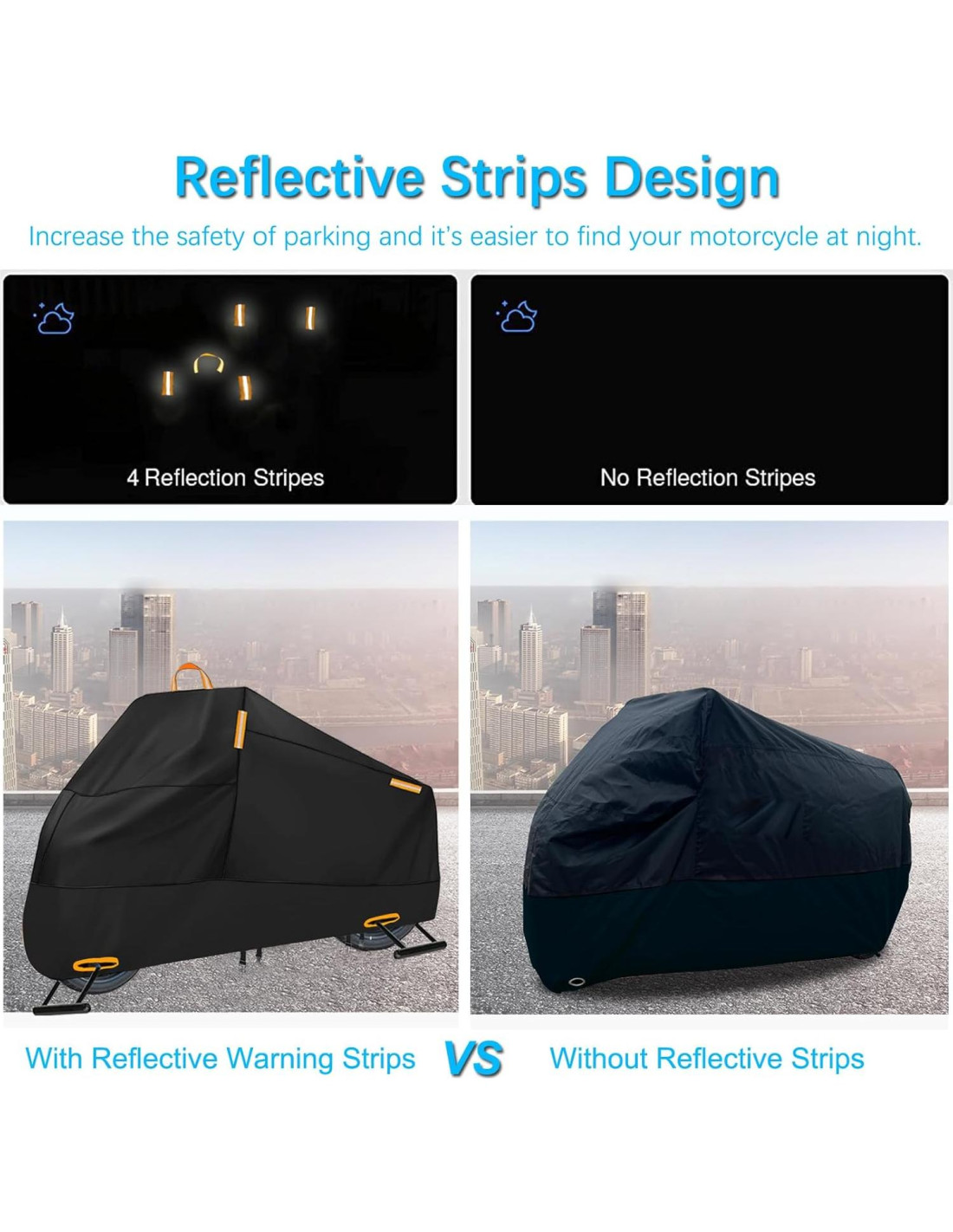 - 4 Tiras Reflectantes y Mango Reflectante Nuestra cubierta de lluvia para motocicleta está equipada con 4 tiras reflectantes en la parte delantera y trasera que facilitan encontrar tu motocicleta y ser llamativa en la oscuridad. El mango reflectante es conveniente para colgar y secar la cubierta.