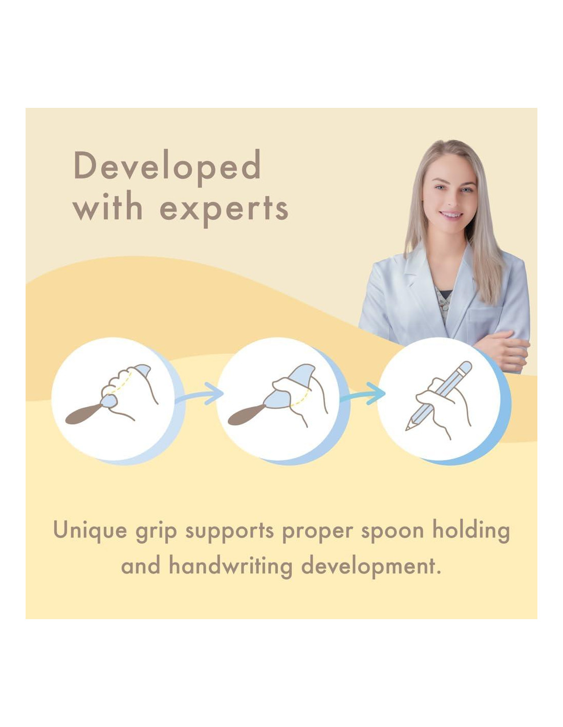 - Diseño de Entrenamiento Patentado Desarrollado en colaboración con terapeutas ocupacionales, nuestros utensilios patentados guían a los niños pequeños a través de un sistema de agarre de dos etapas, comenzando con un agarre palmar (agarre en puño) y transicionando a un agarre de trípode de tres dedos. Este enfoque estructurado ayuda a los bebés a aprender a alimentarse por sí mismos más rápido, mientras sienta las bases para una correcta posición de las manos y futuras habilidades de escritura.