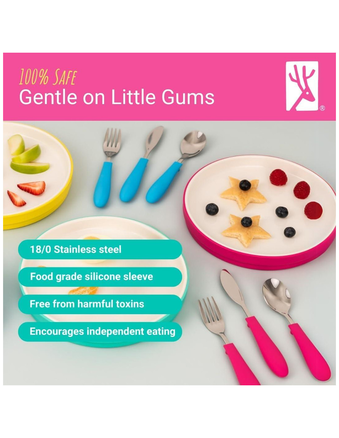 - MANGO DE SILICONA: La cuchara, tenedor y cuchillo de Elk y Amigos cuentan con una punta de acero inoxidable y un mango ergonómico de silicona antideslizante fácil de agarrar, lo que facilita su uso para manos pequeñas.