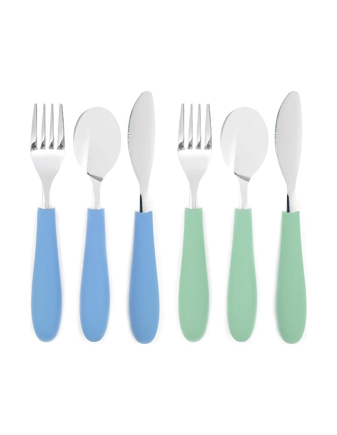 - NIÑOS MAYORES: Diseñado para niños mayores (4 años+) con mangos más largos y punta de cuchara y tenedor más ancha. El borde del cuchillo serrado tiene una hoja redondeada sin bordes afilados para mantenerlo seguro para los deditos. Este cuchillo se puede usar de forma segura para cortar todo tipo de carnes y verduras, fomentando la independencia de los niños y construyendo su confianza.