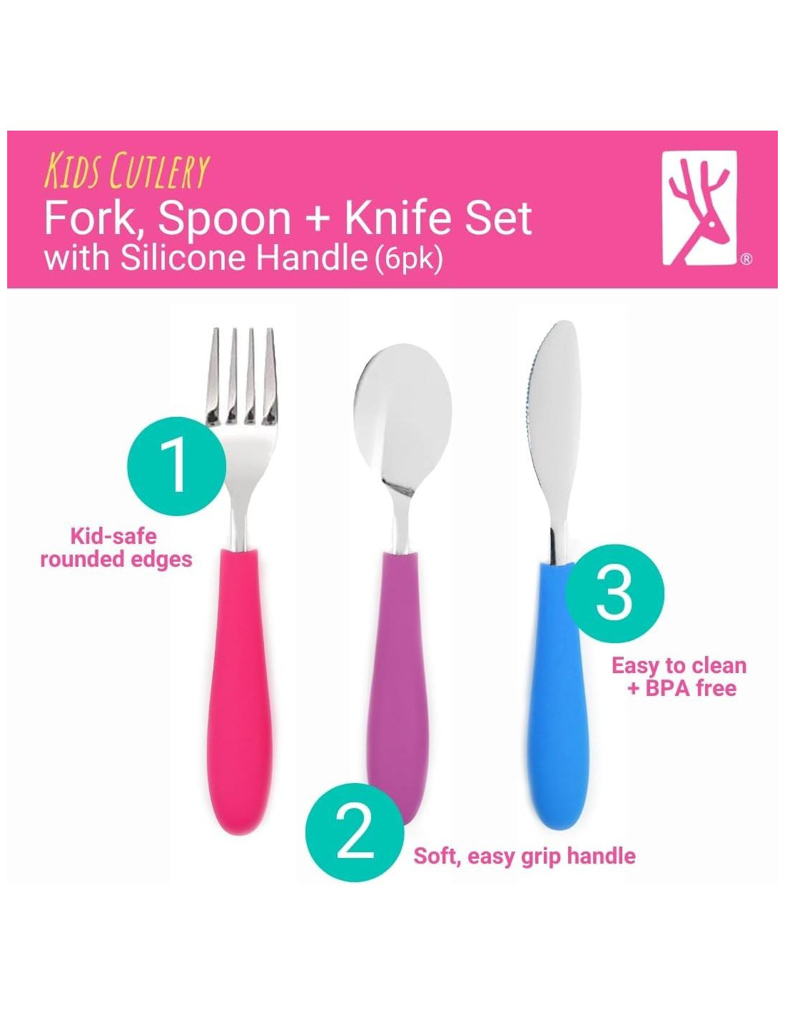 - MANGO DE SILICONA: La cuchara, tenedor y cuchillo de Elk y Amigos cuentan con una punta de acero inoxidable y un mango ergonómico antideslizante de silicona fácil de agarrar, lo que facilita su uso para manos pequeñas.