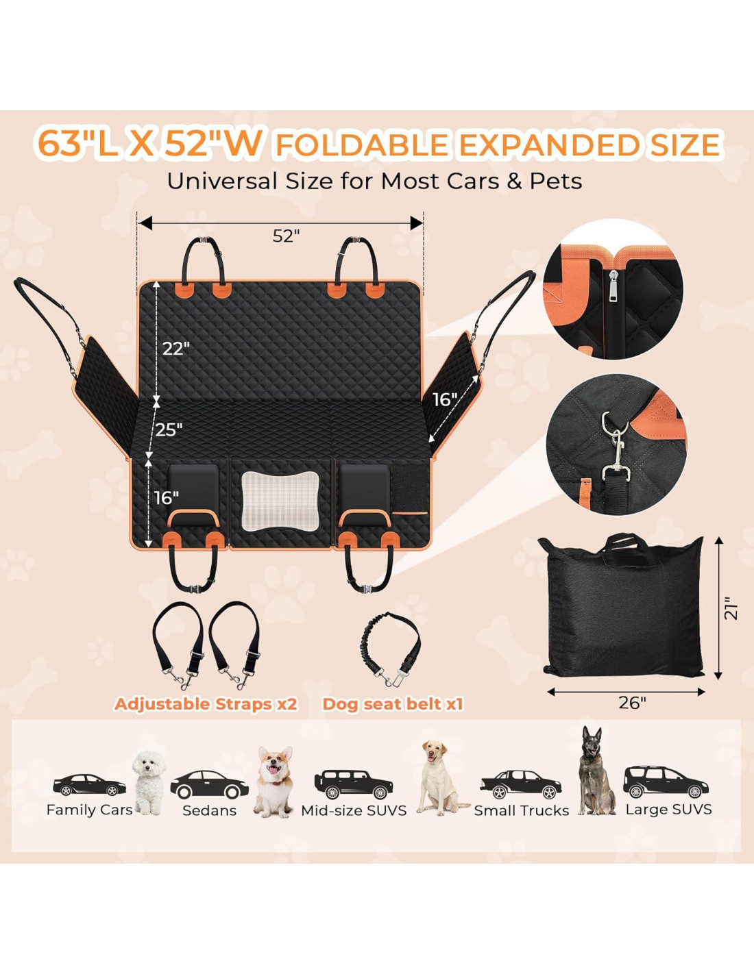 - Usos recomendados para el producto: funda de asiento de coche para perros en el asiento trasero, hamaca para perros en el coche, extensor de asiento trasero para perros, funda de asiento de coche de fondo duro para perros, protector de asiento de coche para perros, asiento de coche para perros de gran tamaño, funda de asiento de coche para perros pequeños, funda de asiento de coche para camioneta/SUV/coche