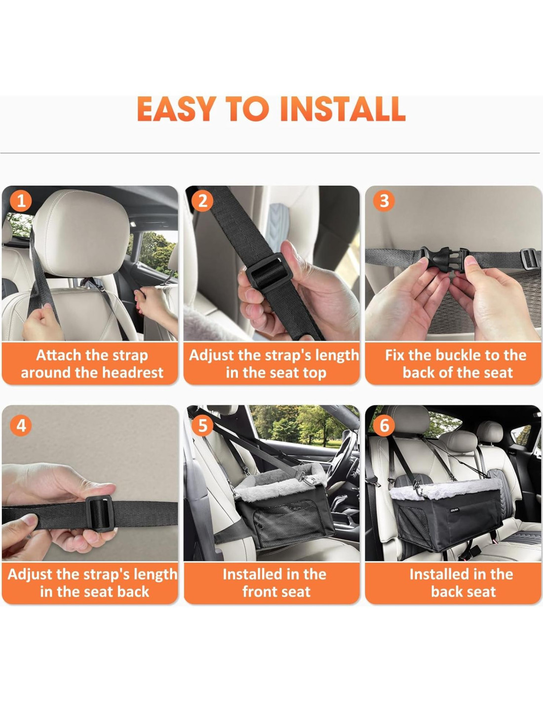 - [Fácil de Instalar]: Con su diseño de hebilla ajustable, el asiento de coche para perros se puede instalar fácilmente. Simplemente sujeta las dos correas alrededor del reposacabezas, fija la hebilla a la parte trasera del asiento y ajusta la longitud de la correa según sea necesario. Se puede instalar tanto en los asientos delanteros como traseros de tu coche, y es compatible con la mayoría de los tipos de asientos de coche y modelos de coches.