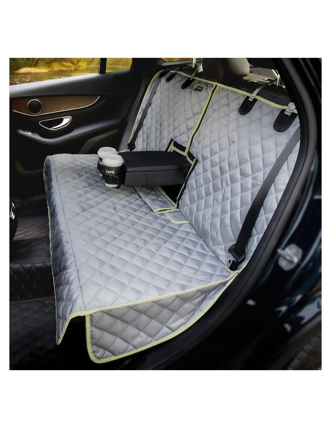- APTO PARA DESCANSABRAZOS Y CINTURÓN DE SEGURIDAD - La funda de asiento de coche podría usar el descansabrazos y el portavasos para proporcionar un ambiente de conducción acogedor. Aberturas incluidas para insertar el cinturón de seguridad para perros que mantienen a tu perro más seguro y evitan que salte al asiento delantero mientras el coche está en movimiento.