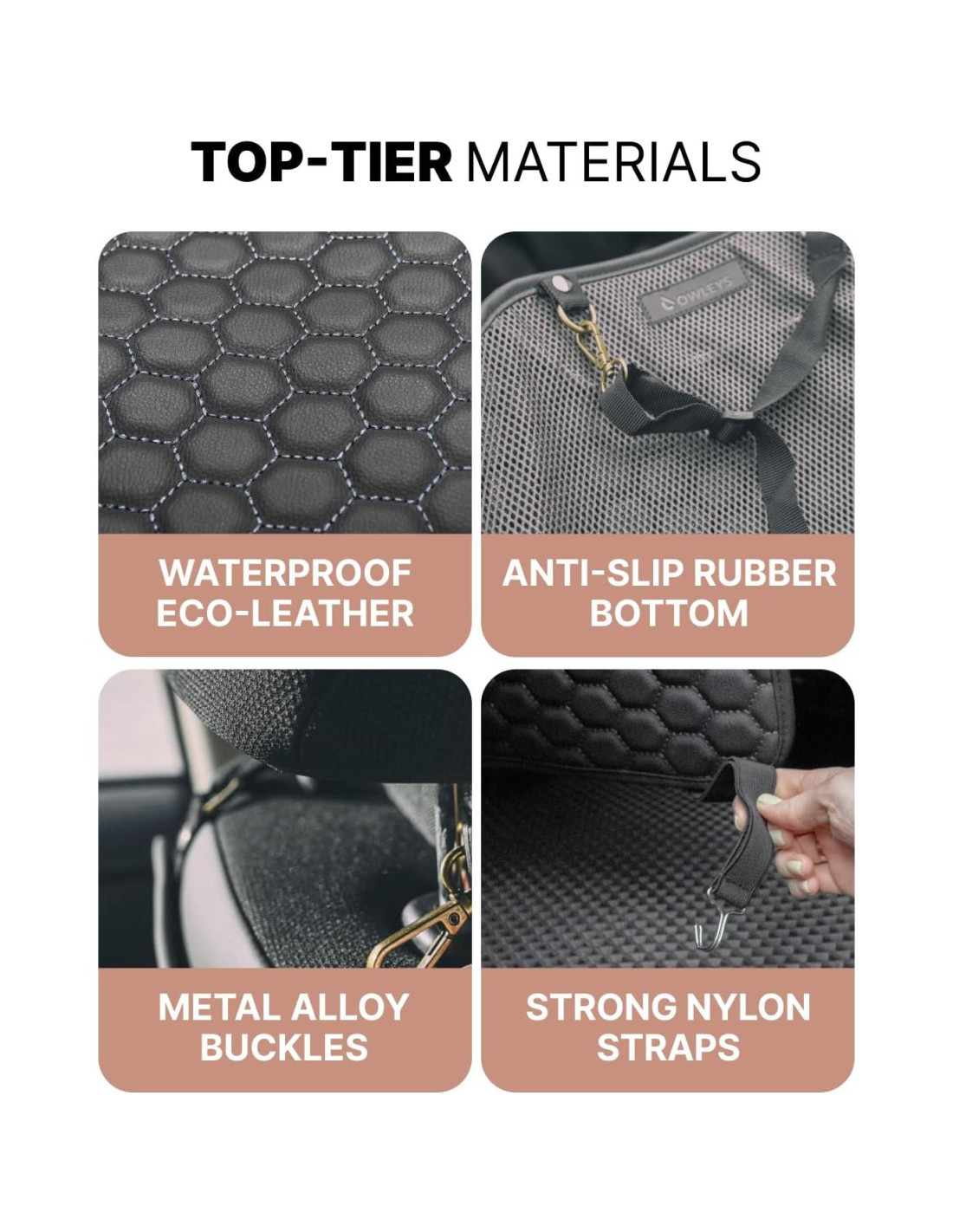 - DURABILIDAD MULTICAPA: El protector de asiento de coche Owleys está hecho con eco-cuero premium, espuma de alta densidad, Oxford 600D, goma antideslizante y hebillas de metal. Este diseño duradero hace que nuestra funda de asiento trasero de coche sea impermeable, duradera y resistente a daños.