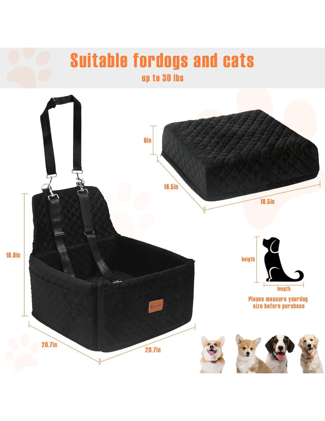 - Desmontable y Lavable: Este asiento elevador para perros en el coche es completamente desmontable y lavable, solo abra la cremallera inferior para sacar la esponja y poner la funda de tela del asiento de coche para perros en la lavadora para limpiarla. CONSEJOS ÚTILES: La cama para perros para el coche está empaquetada al vacío, después de abrir el paquete, espere pacientemente alrededor de 24-48 horas para que recupere su mejor estado.