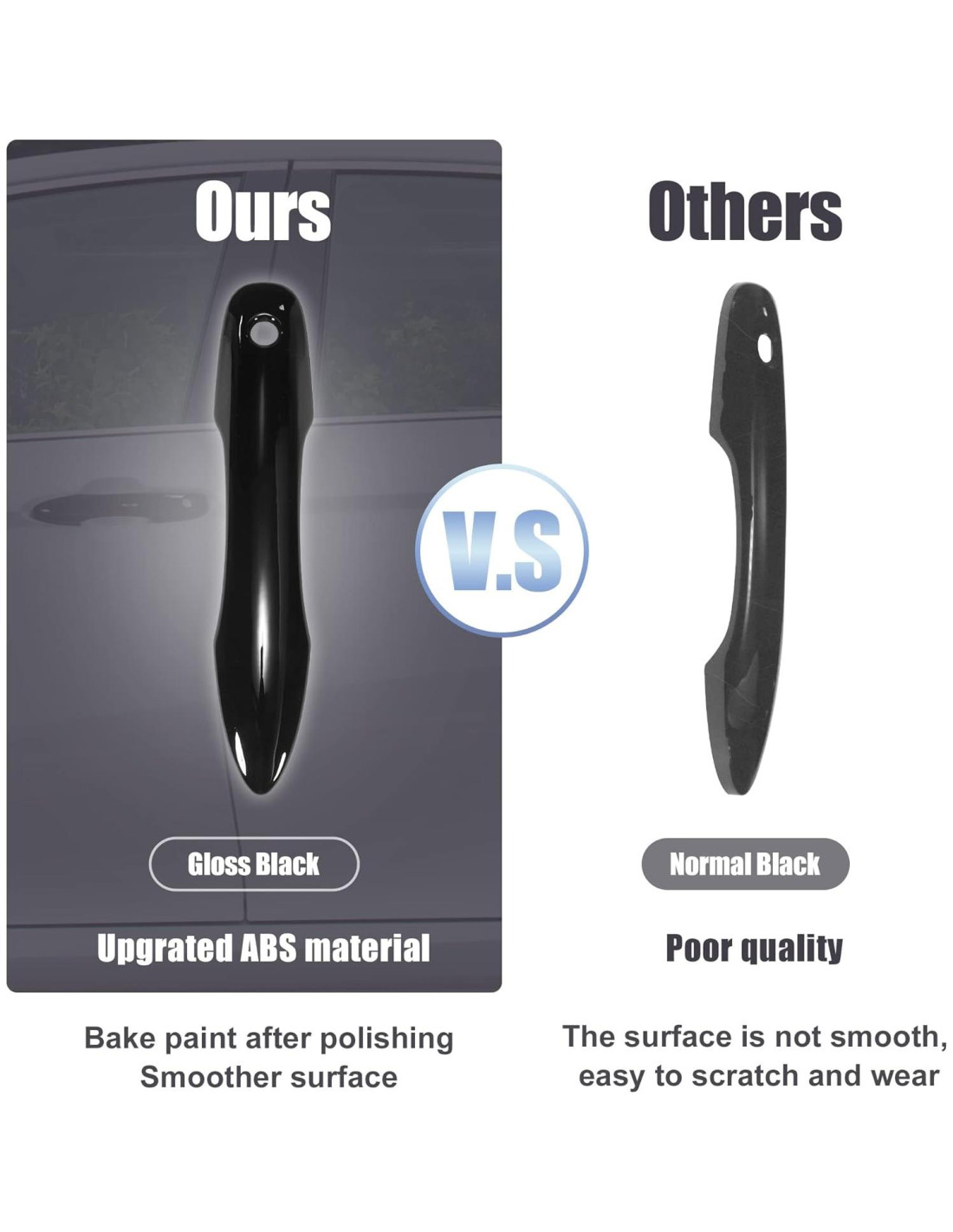 - Características: La cubierta de manija de puerta negra brillante mejora la apariencia de su automóvil. También puede cubrir rasguños existentes y prevenir que la puerta de su automóvil se raye y se desgaste.