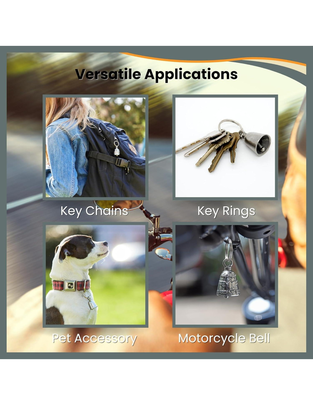 - OPCIONES DE SUJECIÓN VERSÁTILES - Usa el llavero adjunto a cada campana para fijarla a tu moto, automóvil, mochila, llavero, barco o cualquier vehículo. También puedes comprar un colgador de campana guardiana para una sujeción más fácil a tu moto.