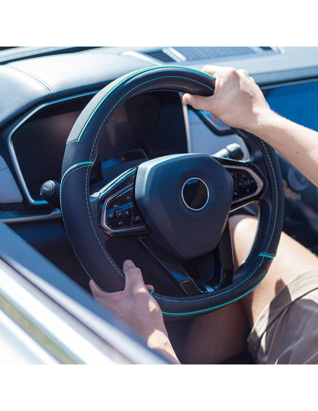 - DISEÑO DEPORTIVO CON CUERO COLORIDO Y PIPING: Se siente muy cómodo al conducir. Protege tus manos del volante ardiente en verano y de los fríos helados en invierno.
