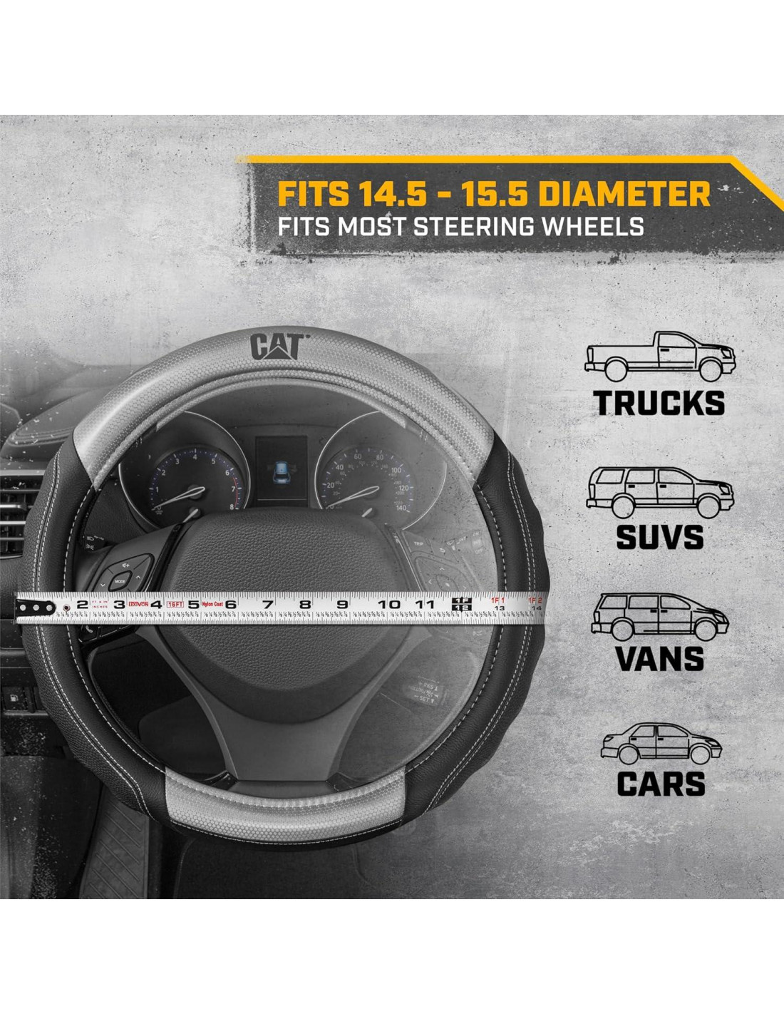 Cubiertas de Volante de Cuero Sintético CAT con Agarre y Control Mejorados: Elaborada por una marca de confianza con más de 100 años de experiencia, esta cubierta mejora tu experiencia de conducción con cuero sintético premium que proporciona la apariencia y sensación de cuero genuino sin el mantenimiento. El material suave y ergonómico asegura un agarre cómodo, reduciendo la fatiga de las manos durante largos viajes o desplazamientos diarios y ofrece una mezcla perfecta de estilo, comodidad y durabilidad. Diseñada para adaptarse a la mayoría de los volantes, esta cubierta cuenta con un anillo de goma antideslizante que la mantiene en su lugar de manera segura, incluso durante giros bruscos o movimientos repentinos. Sus propiedades aislantes protegen tus manos de temperaturas extremas, manteniendo el volante fresco en verano y cálido en invierno. Ya sea que estés conduciendo en clima cálido o en condiciones frías, esta cubierta asegura un agarre agradable y antideslizante durante todo el año. La cubierta de volante de cuero sintético CAT también es increíblemente fácil de instalar y mantener. Simplemente deslízala sobre tu volante, y estarás listo para conducir. Limpiar es muy fácil: solo límpiala con un paño húmedo para mantenerla luciendo fresca y nueva. Disponible en una variedad de tamaños y opciones de diseño, la cubierta de volante Caterpillar añade un toque de sofisticación al interior de tu auto. Su construcción duradera, diseño elegante y características prácticas la convierten en un accesorio ideal para cualquiera que busque comodidad, control y un aspecto moderno para su vehículo. Algunos ejemplos de marcas y modelos de autos o camiones que estas cubiertas de volante se adaptarán incluyen: Todos los Camiones Semi, Ford (F150, F250, F350, Explorer, Ranger, Escape, Expedition, Fusion, Lightning Mustang), Toyota (Tacoma, Rav4, Highlander, Prius, Tundra, Camry, Corolla), Chevrolet (Chevy Silverado 1500, Colorado, Traverse, Dodge, Honda (Civic, Accord, CRV, Pilot, Odyssey, HR-V), Nissan, Jeep, Tesla, Kia, Audi, Subaru, Hyundai, BMW, Mercedes, Lexus, y más!