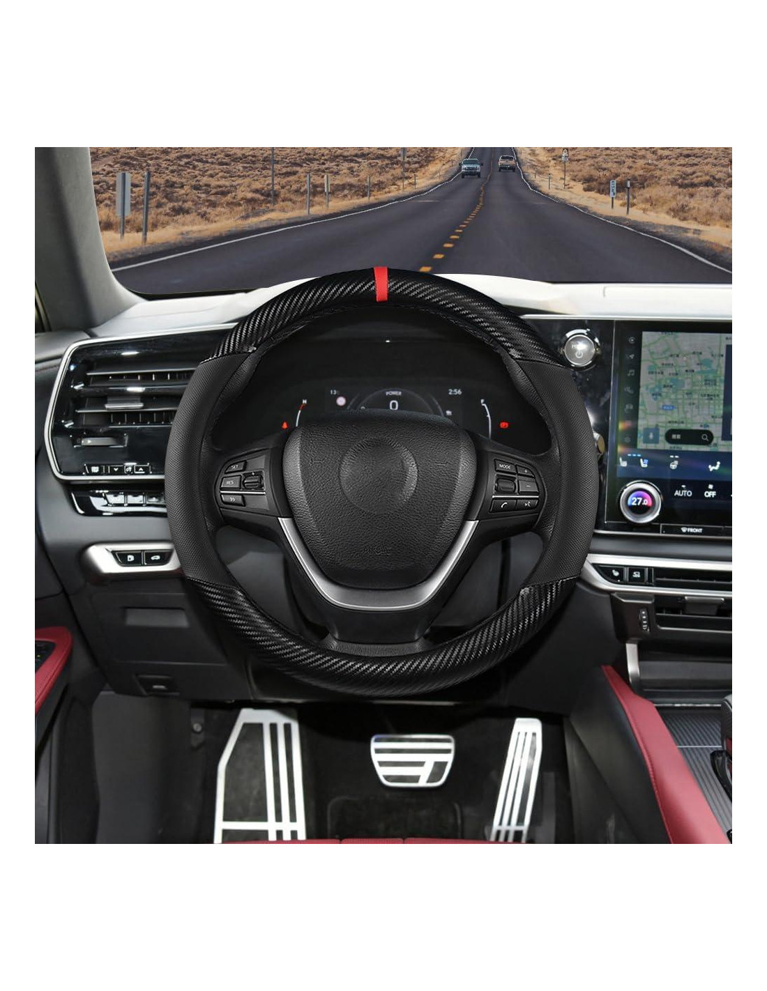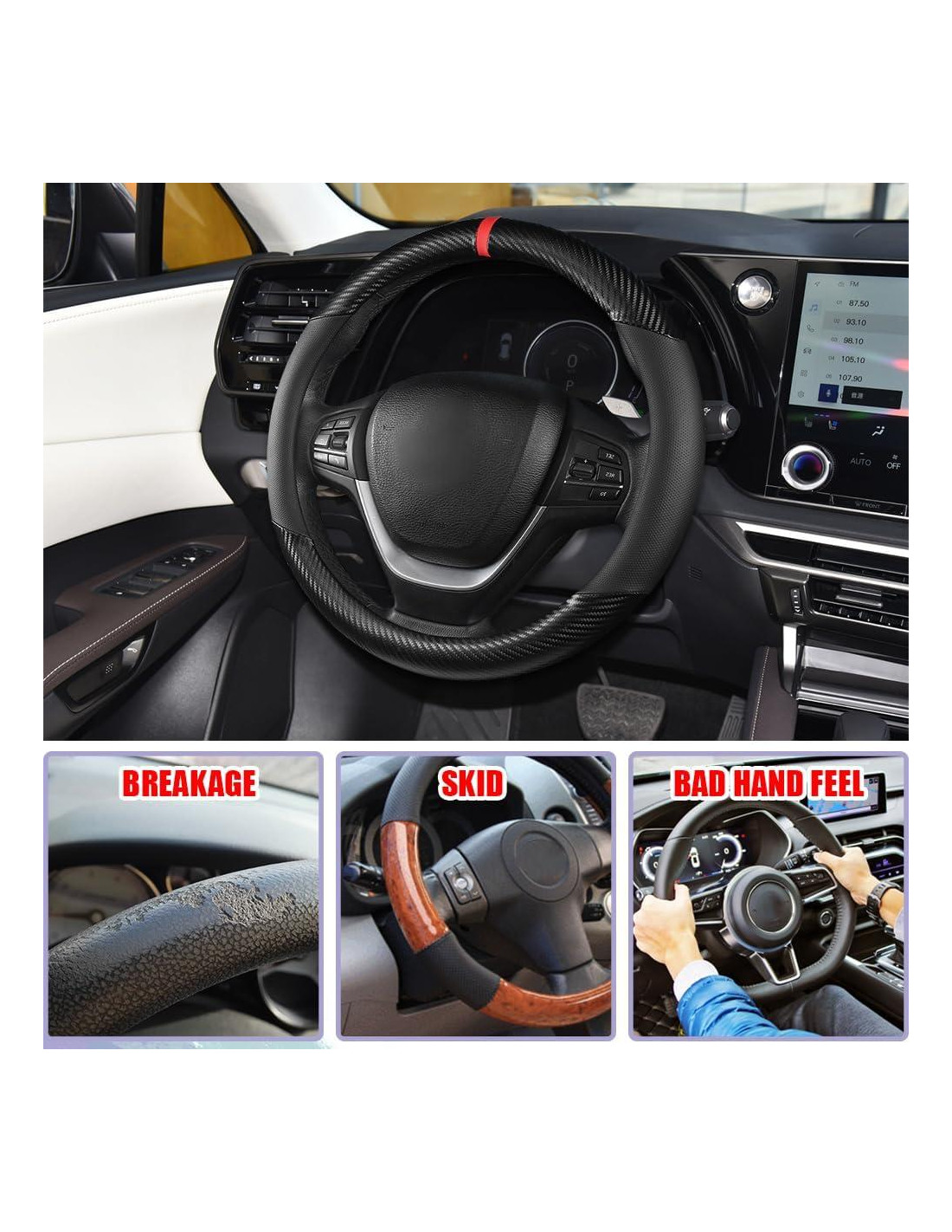- [Práctica y hermosa]: Nuestra cubierta de volante de coche de fibra de carbono no solo puede proteger su volante de arañazos, desgaste o quemaduras solares, sino que también mantiene su volante en condiciones de nuevo todo el tiempo. Además, adopta un diseño novedoso y único para realzar la estética del interior de su coche. Si también es un entusiasta de los coches, no se pierda este accesorio de volante práctico y hermoso.