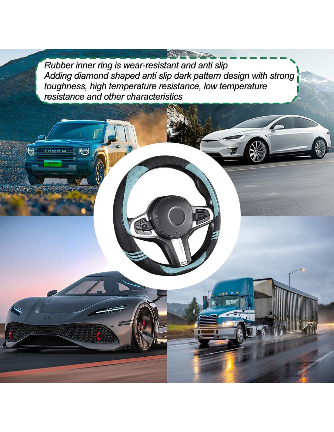 - Amplia Aplicación: Esta cubierta de volante de coche se utiliza ampliamente para volantes de tamaño mediano con un diámetro exterior de aproximadamente 15 pulgadas (38.1 cm), y su tamaño universal está ingeniosamente diseñado para adaptarse a una amplia gama de vehículos, incluidos coches, SUV, furgonetas y camiones. Esta cubierta de volante de coche tiene un ajuste envolvente de 360, por lo que no necesitas preocuparte por que la cubierta se deslice o se caiga, ya sea que estés frenando con fuerza o haciendo un giro brusco.
