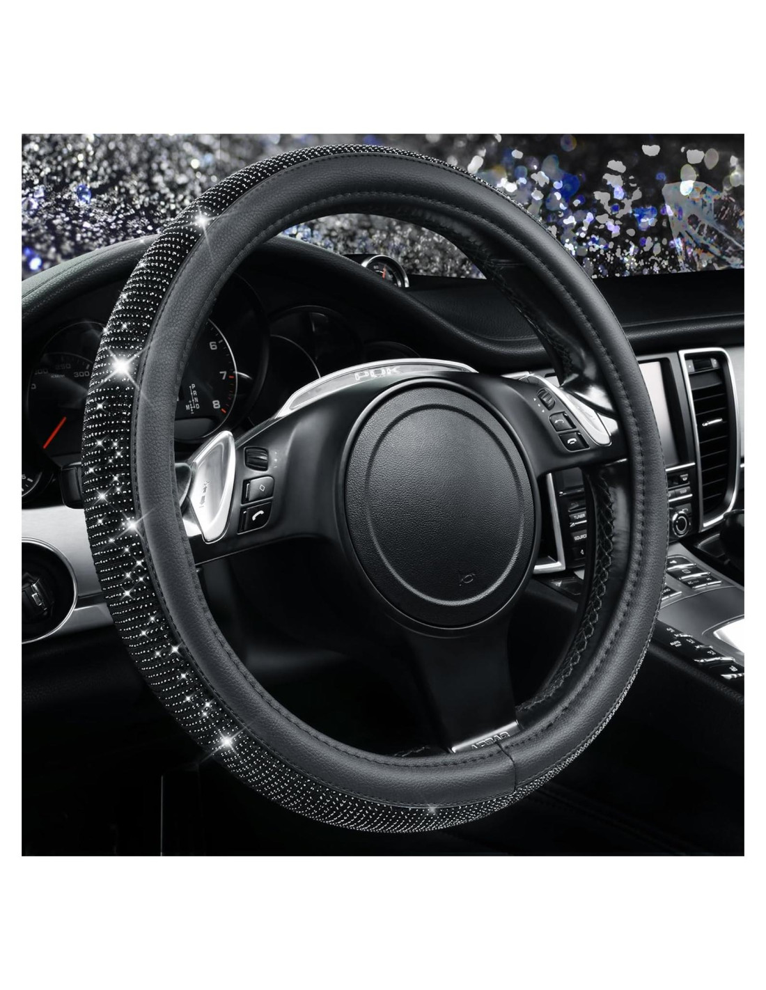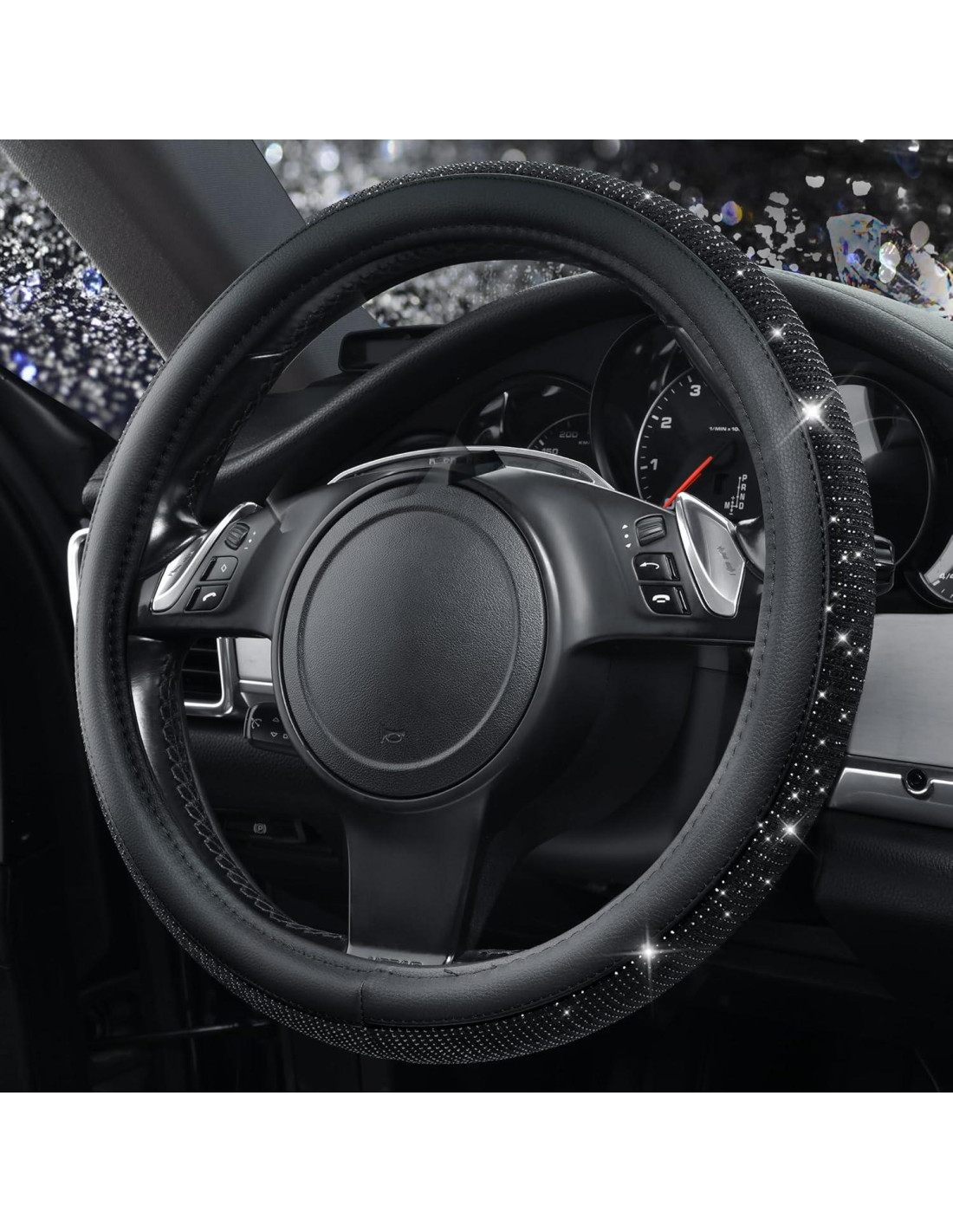 - DIAMANTE Y CUERO: Material de Calidad Premium: Cuero PU y trabajo artesanal de diamantes de alta calidad. Los diamantes negros sobre el terciopelo. La funda de volante brillante está hecha de cuero microfibra duradero y diamantes, compuesta por cientos de brillantes strass. Super Brillante, Mejor Enfoque, Diamante No Caído, Sensación Cómoda, no raspa las manos y tiene buen efecto antideslizante.