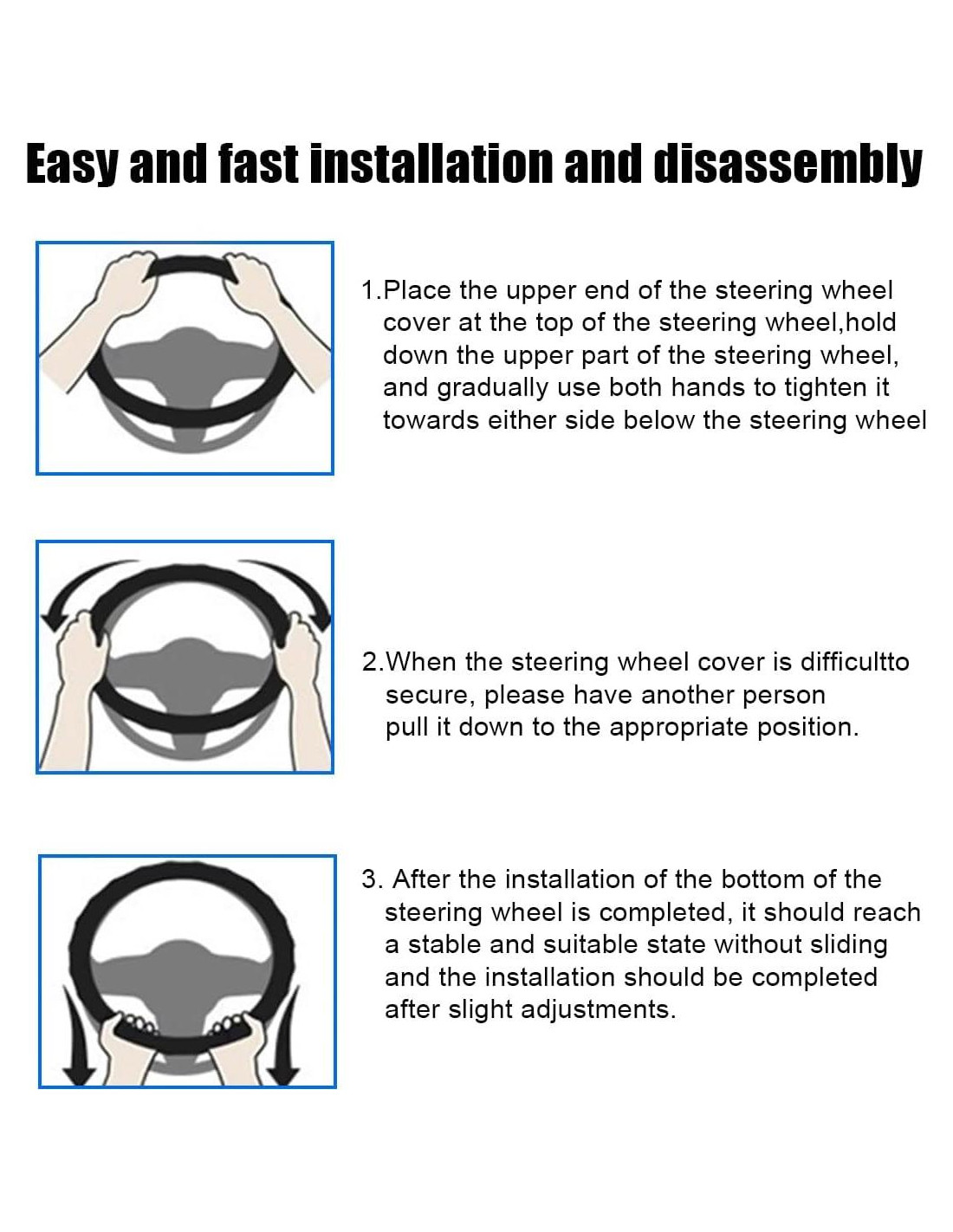 - Fácil de Instalar y Quitar: Esta cubierta de volante de coche es fácil de instalar y quitar. Primero, debes colocar la cubierta del volante en la parte superior del volante. Luego, solo necesitas presionar la parte superior de la cubierta del volante y usar ambas manos para tirar de los lados de la cubierta del volante hacia abajo gradualmente para que cubra completamente el volante y se ajuste firmemente al volante para completar la instalación.