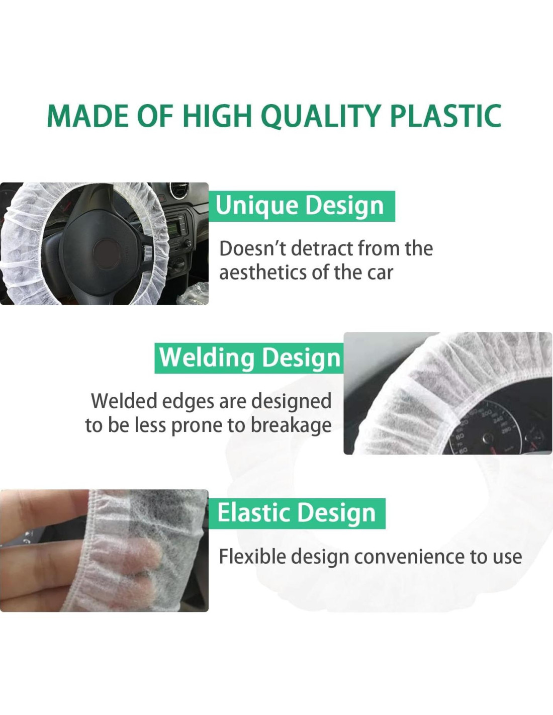- [Ordenado y Limpio] : Esta funda de volante desechable está diseñada para ayudar a mantener el interior de tu coche limpio. Previene eficazmente que manos sucias y otros contaminantes entren al coche. Mantiene tu volante alejado de manchas de grasa, hace que tu coche luzca limpio y ordenado, y te brinda una experiencia de conducción cómoda.