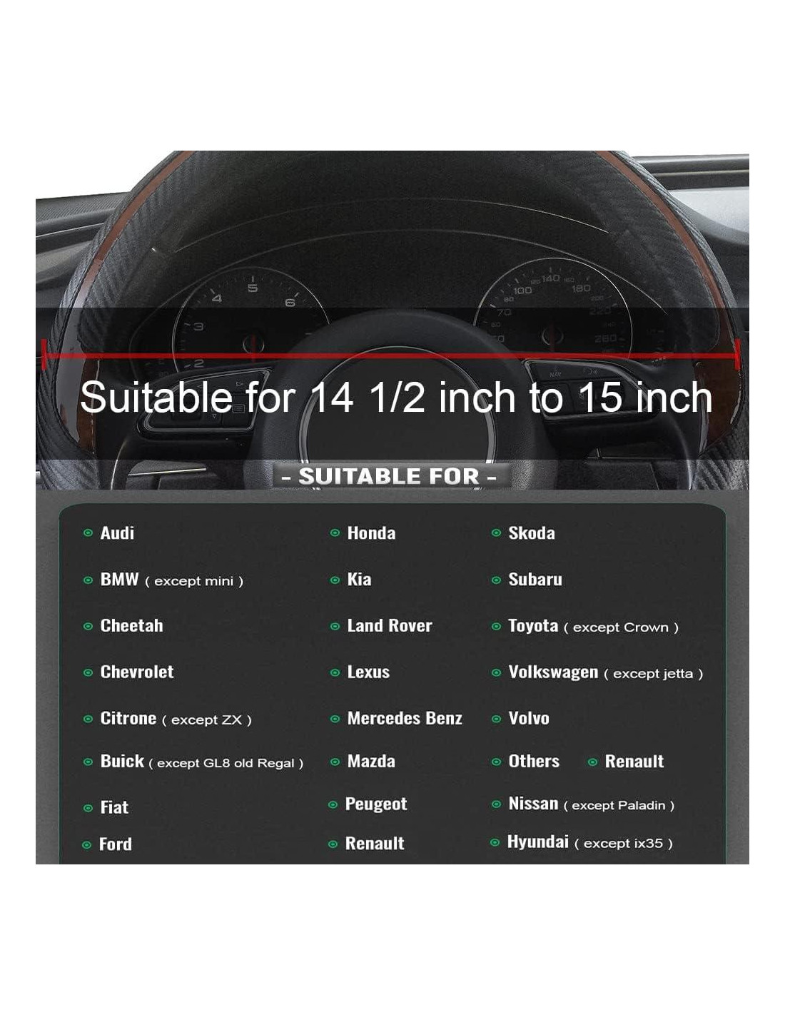 - Tamaño Ajustado: Adecuado para todos los volantes de tamaño mediano con un diámetro de 14 1/2 pulgadas a 15 pulgadas (37 cm a 39 cm). Consejos íntimos: calentar con un secador de pelo durante unos minutos antes de usar la cubierta del volante será más útil para su instalación.