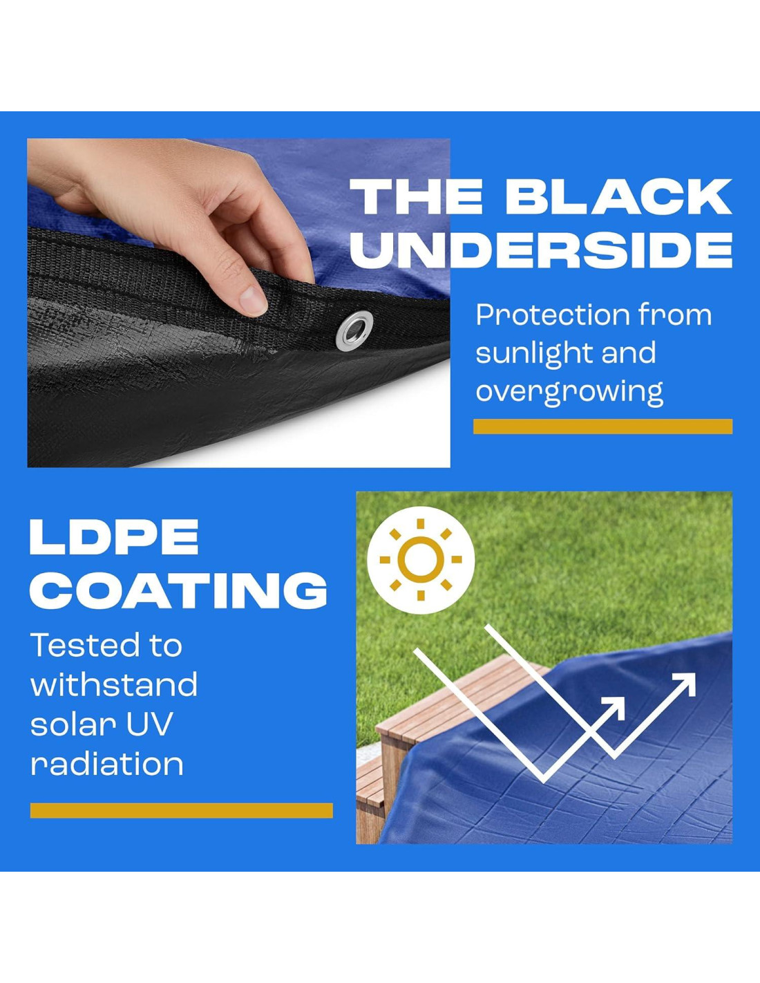 - PROTECCIÓN CONTRA LA LUZ SOLAR Y EL CRECIMIENTO EXCESIVO. Un kit de cierre de piscina para sobre suelo debe proteger la piscina de la radiación UV que se mantiene alta en invierno. Nuestro kit de cierre de piscina tiene un recubrimiento de LDPE que soporta los UV solares. La PARTE INFERIOR NEGRA de la cubierta ovalada de la piscina no permitirá que el agua crezca.