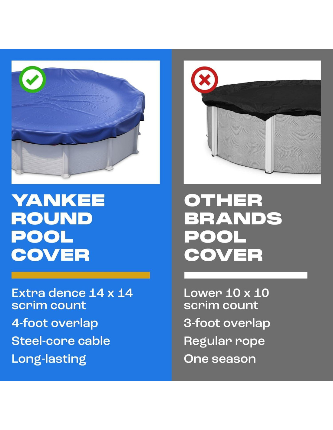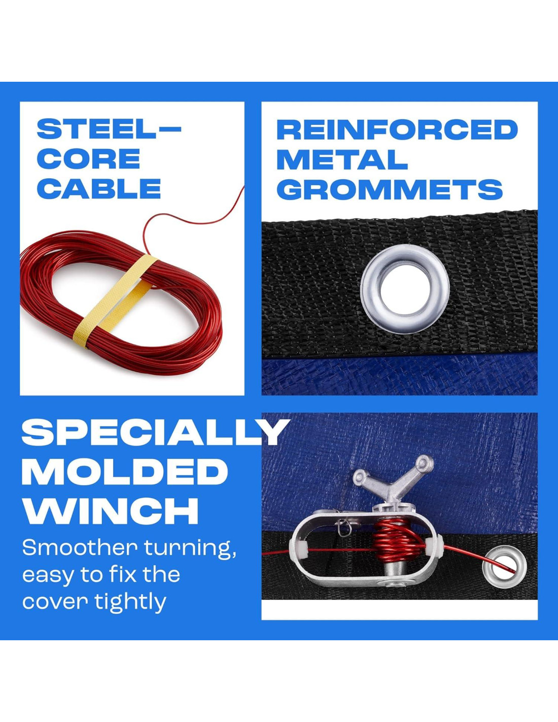 - FIJACIONES FUERTES PARA UN AGARRE MÁS FIRME. Para asegurarte de que tu cubierta de piscina de invierno no colapse, nuestras cubiertas de piscina para piscinas sobre suelo tienen un cable de núcleo de acero que se inserta en ojales de metal reforzados, por lo que puedes considerar que tu envoltura de piscina está bien ajustada. Un cabrestante moldeado especialmente gira suavemente y facilita realmente apretar el cable.
